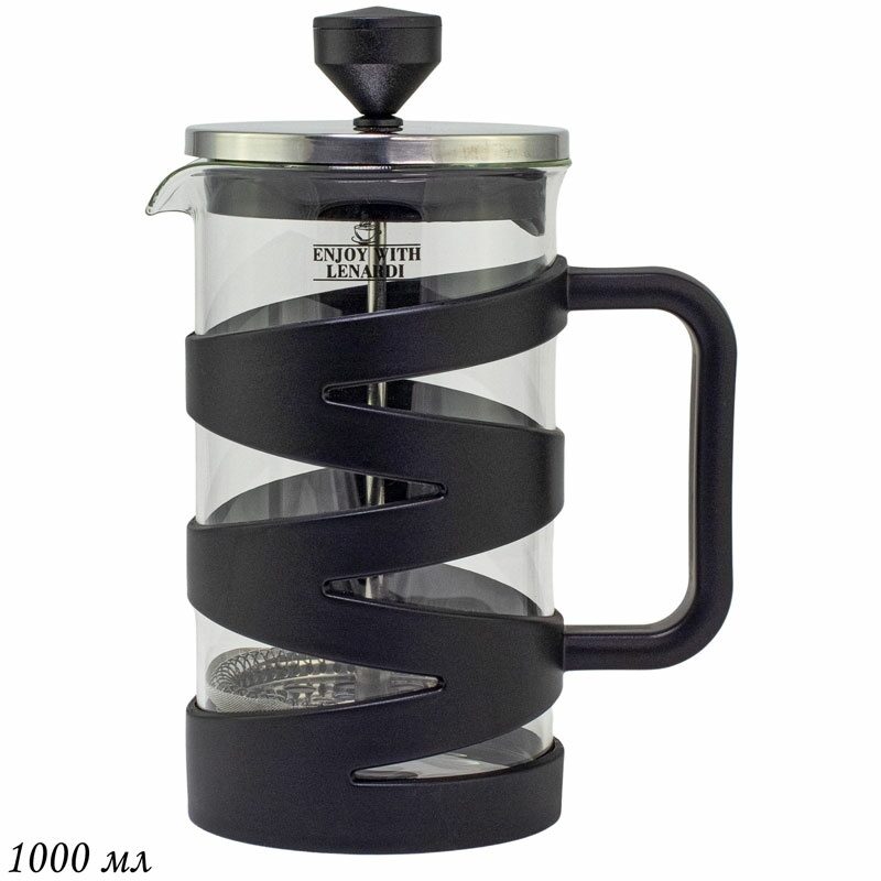 Френч-пресс со стеклянной колбой. Прочная колба из боросиликатного стекла устойчива к перепадам температуры, а пластиковый каркас надежно фиксирует ее.