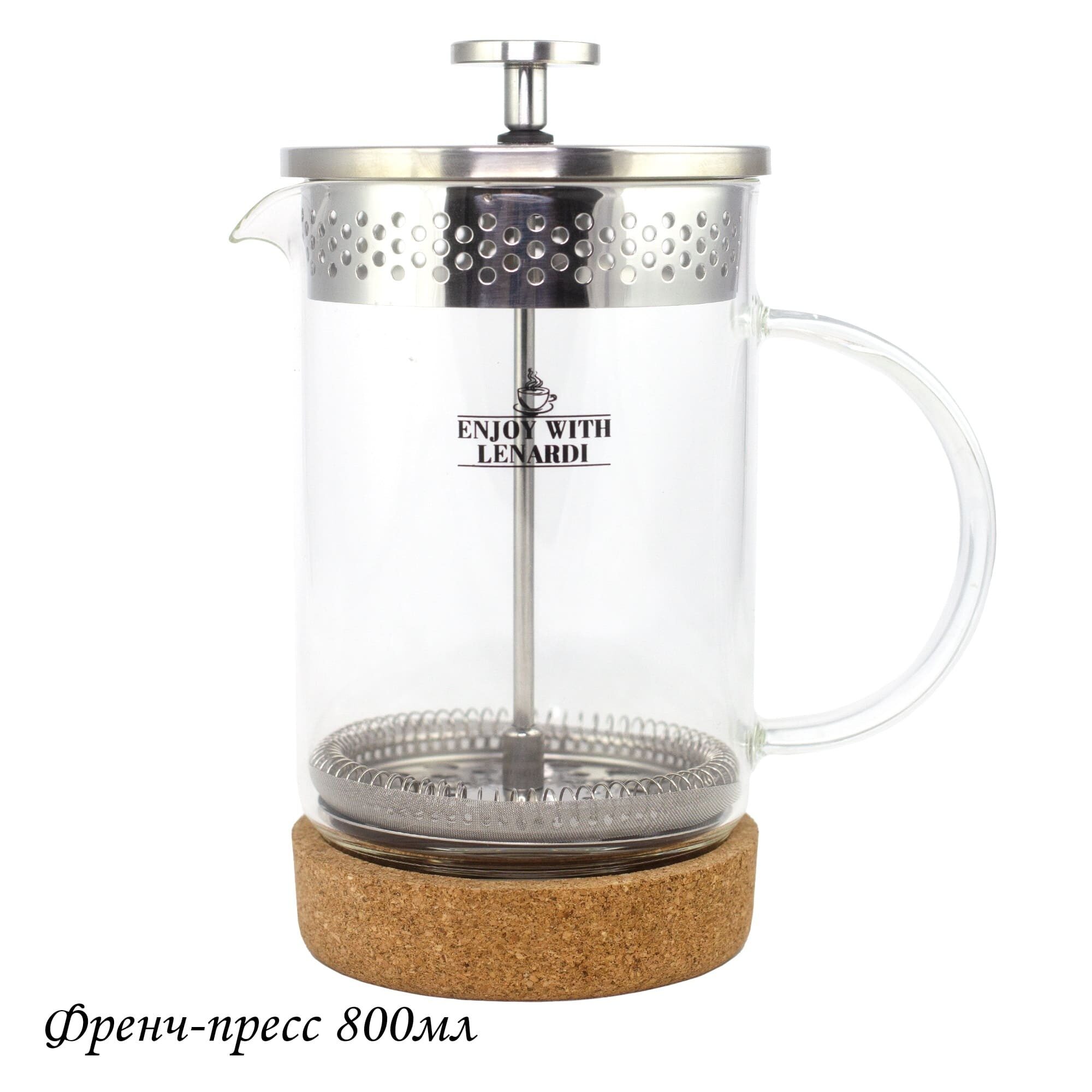 Френч-пресс со стеклянной колбой. Прочная колба из боросиликатного стекла устойчива к перепадам температуры, подставка из пробки создает нескользящий эффект, подставка съемная
