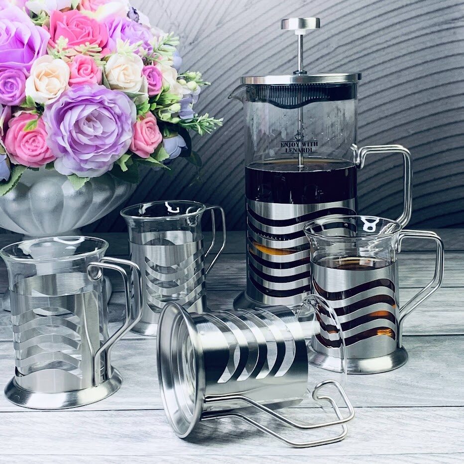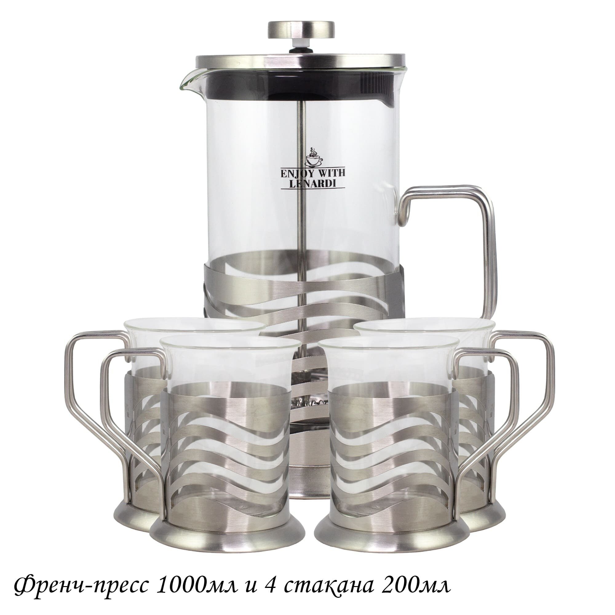 Френч-пресс со стеклянной колбой. Прочная колба из боросиликатного стекла устойчива к перепадам температуры, а металлический каркас надежно фиксирует ее.