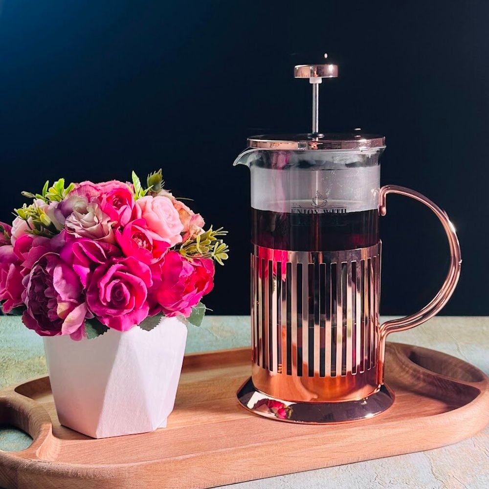 Френч-пресс со стеклянной колбой. Прочная колба из боросиликатного стекла устойчива к перепадам температуры, а металлический каркас надежно фиксирует ее.