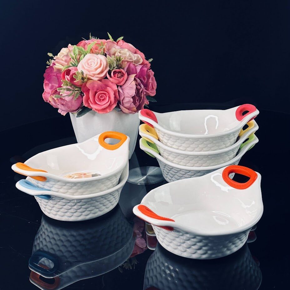 Жаропрочный фарфор - серия представлена в виде прямоугольных, квадратных, овальных и круглых блюд разного объема, круглых кастрюль и порционных формочек.