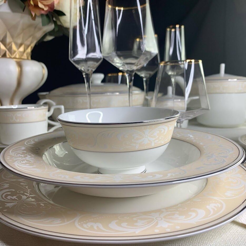 Коллекция Джульетта изготовлена из тончайшего костяного фарфора. Посуду отличает тонкая серебряная окантовка, борт нежно бежевого цвета с белыми объемными узорами.