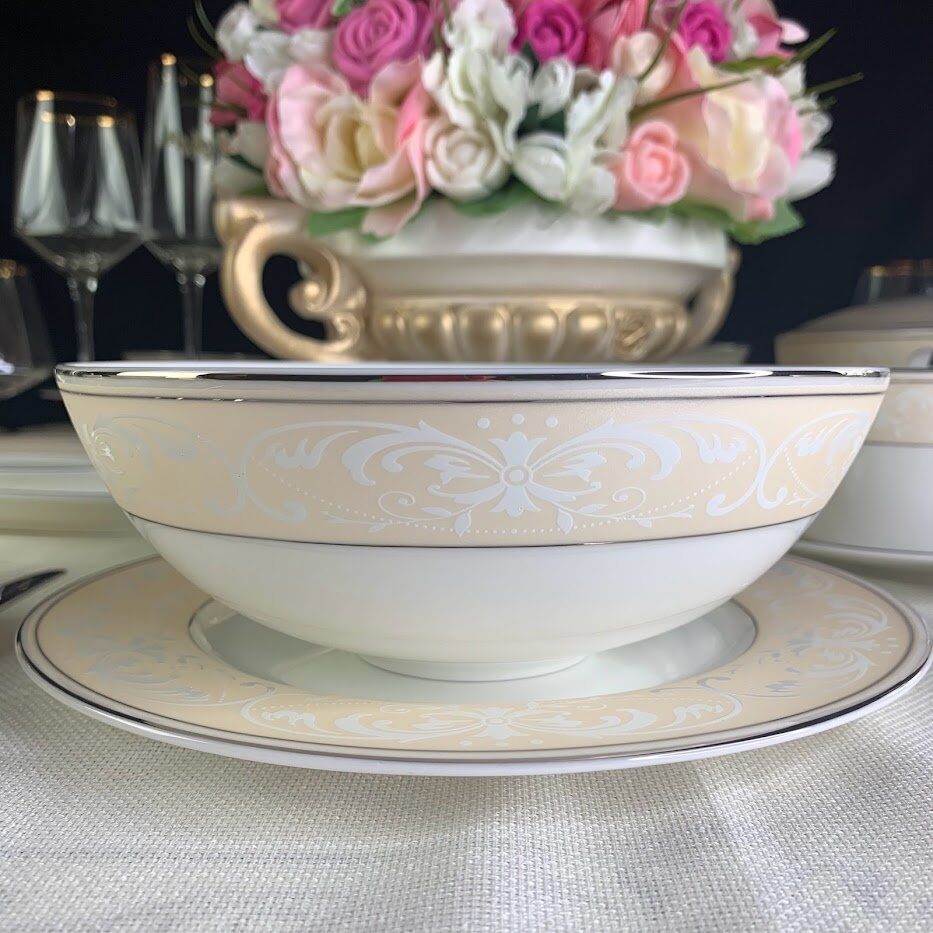 Коллекция Джульетта изготовлена из тончайшего костяного фарфора. Посуду отличает тонкая серебряная окантовка, борт нежно бежевого цвета с белыми объемными узорами.