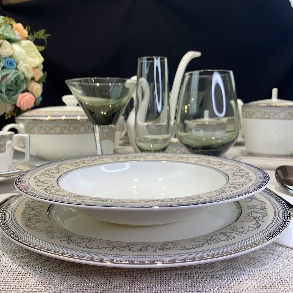 Коллекция ЭЛЕГАНТ изготовлена из легкого костяного фарфор. Борт посуды имеет матовый бежевый фон с серым рисунком и окантовкой хамелеон, который меняет цвет в зависимости от освещения, от серого до золотого. Коллекция состоит из обеденных, чайных и кофейных сервизов, предметов сервировки