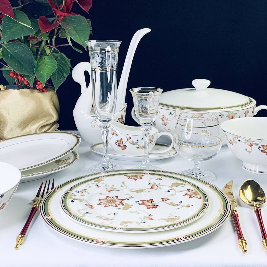 Тонкий белоснежный фарфор, и классический цветочный декор, потрясающие изящество отличают эту коллекцию. Идеальное сочетание благородного зеленого цвета с цветами осеннего леса, с добавлением золотых элементов и золотой обводкой