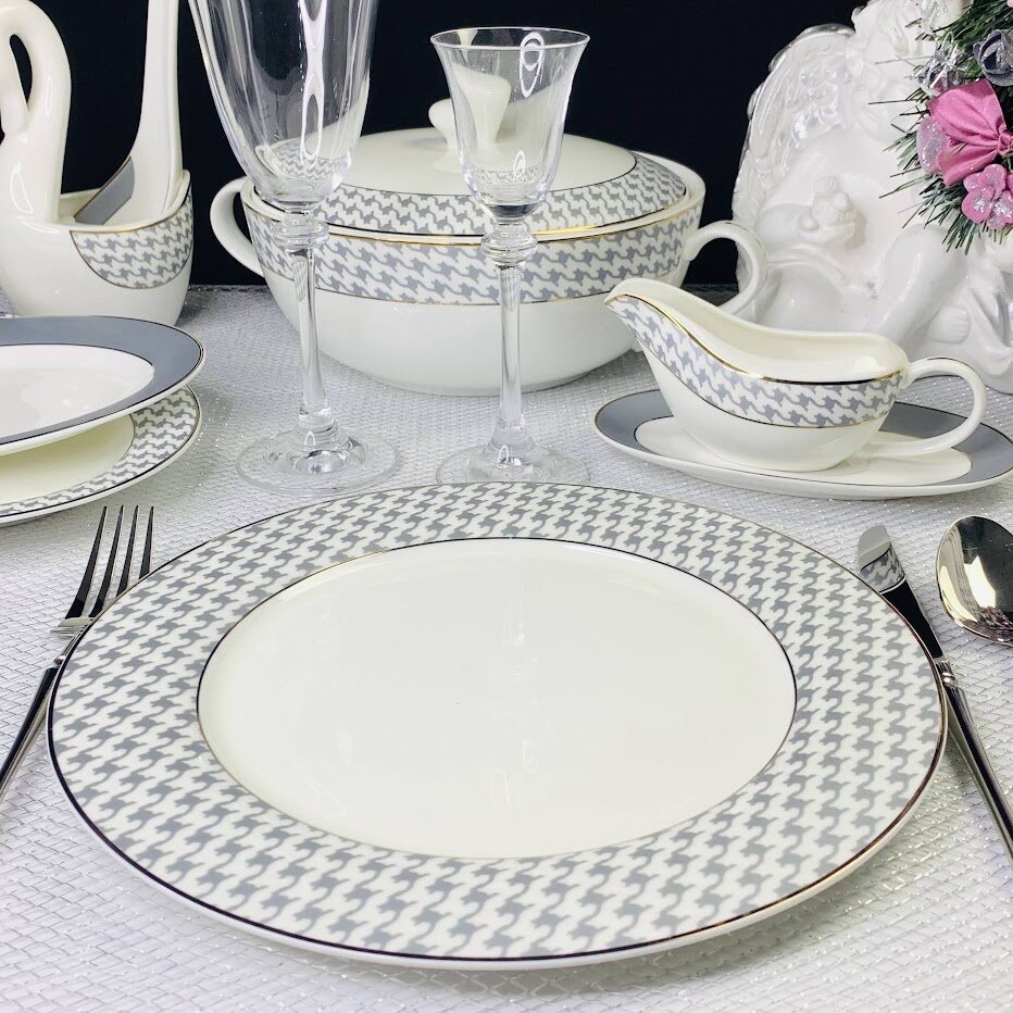 Коллекция EARL GREY - тончайший костяной фарфор. Высокое качество нанесения декора, элегантная классическая форма с гладкими краями, модное сочитание серебрянного декора и золотой отводки по краю отличают эту коллекцию от других.