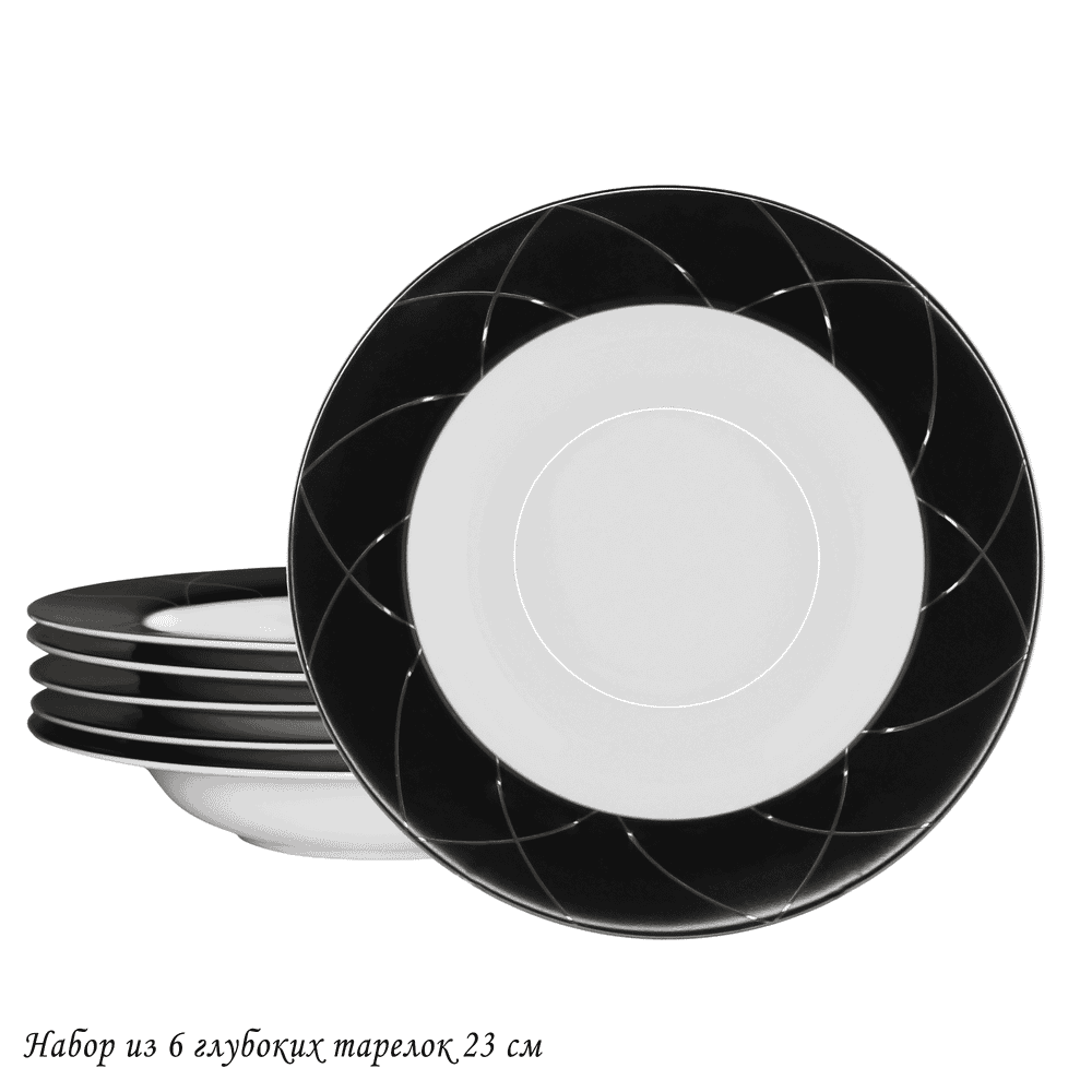 Коллекция PANDORA изготовлена из тонкого костяного фарфора белоснежного цвета. Бортик покрыт черной глазурью с тонкой серебряной сеткой и обводкой. Классическая линейка предметов сервировки: блюда, тарелки, салатники, сервизы и штучные предметы
