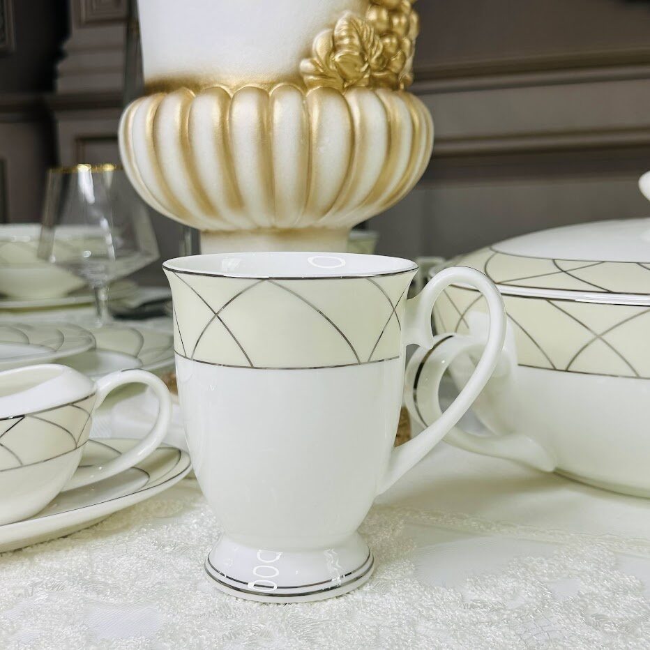 Коллекция PANDORA CREAM изготовлена из тонкого костяного фарфора белоснежного цвета. Бортик покрыт товой глазурью цвета шампанского с тонкой серебряной сеткой и обводкой. Классическая линейка предметов сервировки: блюда, тарелки, салатники, сервизы и штучные предметы