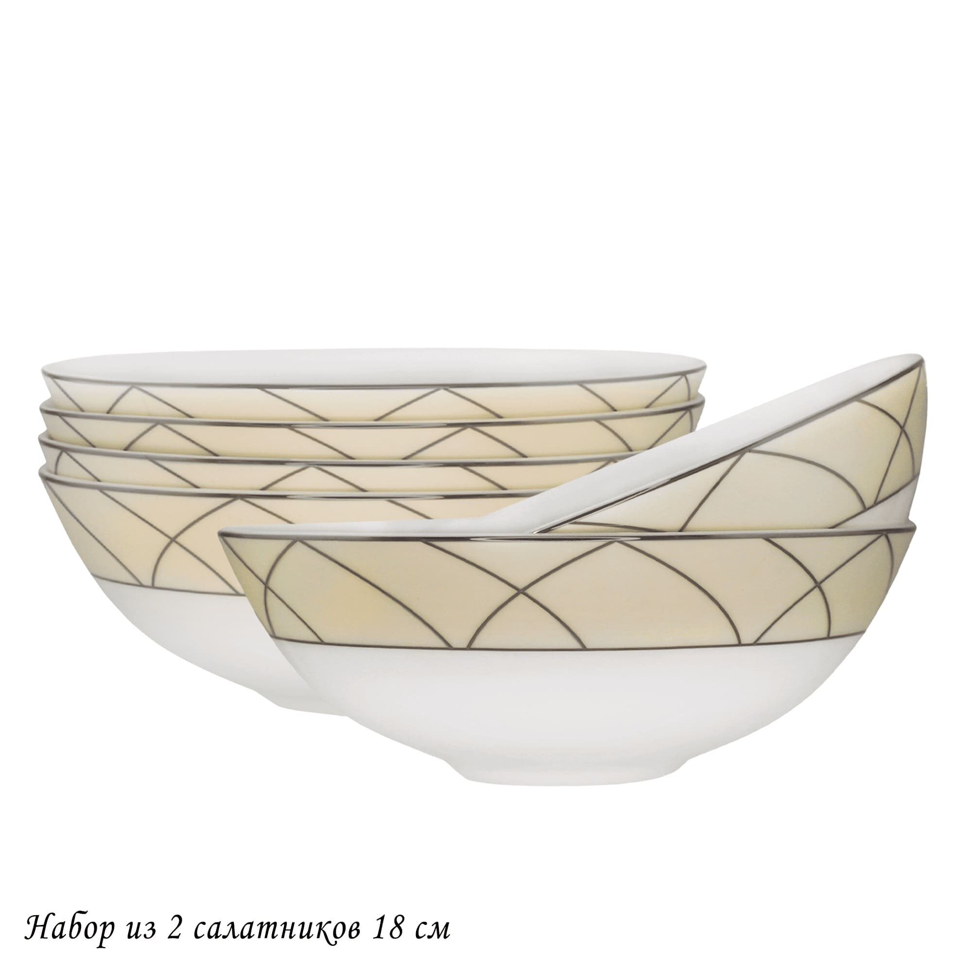 Коллекция PANDORA CREAM изготовлена из тонкого костяного фарфора белоснежного цвета. Бортик покрыт товой глазурью цвета шампанского с тонкой серебряной сеткой и обводкой. Классическая линейка предметов сервировки: блюда, тарелки, салатники, сервизы и штучные предметы