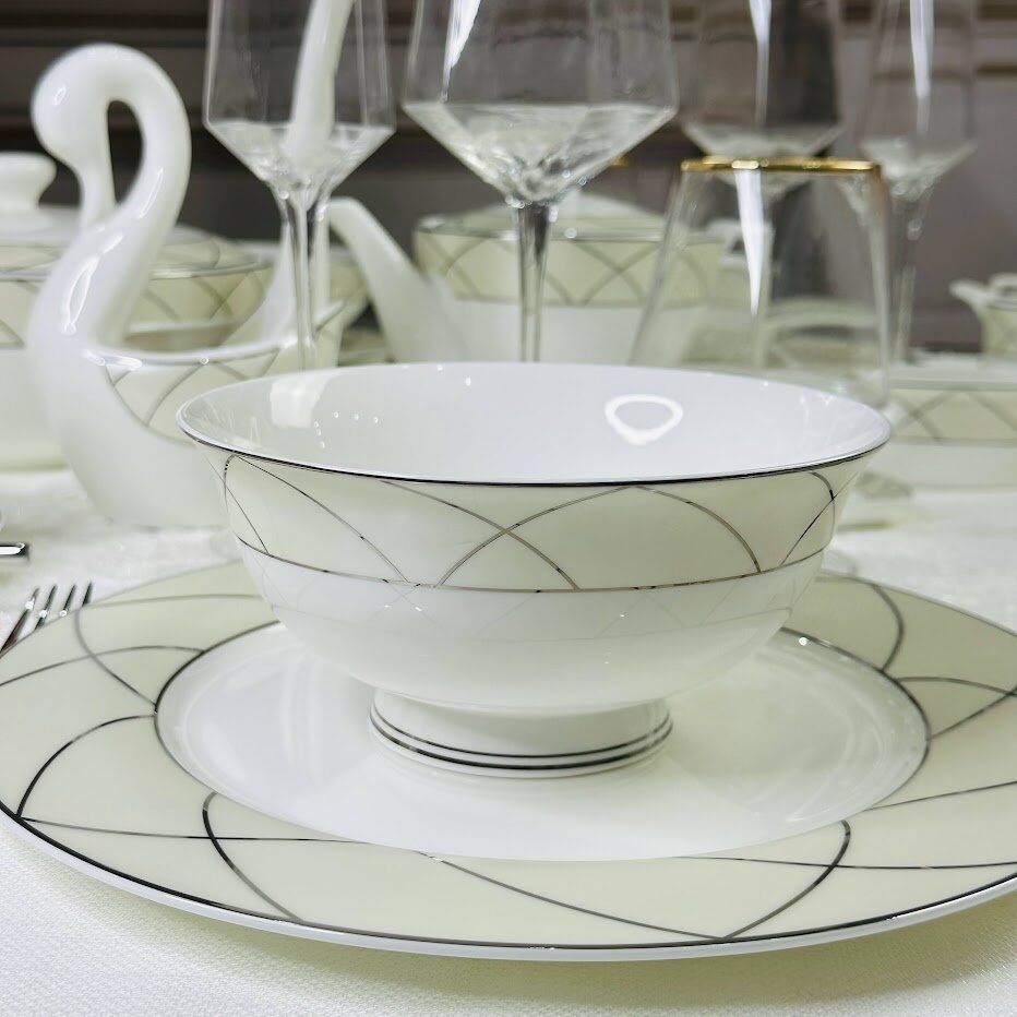Коллекция PANDORA CREAM изготовлена из тонкого костяного фарфора белоснежного цвета. Бортик покрыт товой глазурью цвета шампанского с тонкой серебряной сеткой и обводкой. Классическая линейка предметов сервировки: блюда, тарелки, салатники, сервизы и штучные предметы Материал: костяной фарфор Не рекомендуется использовать в микроволновой печи и мыть в посудомоечной машине, по причине возможного повреждения золотого декоративного покрытия.