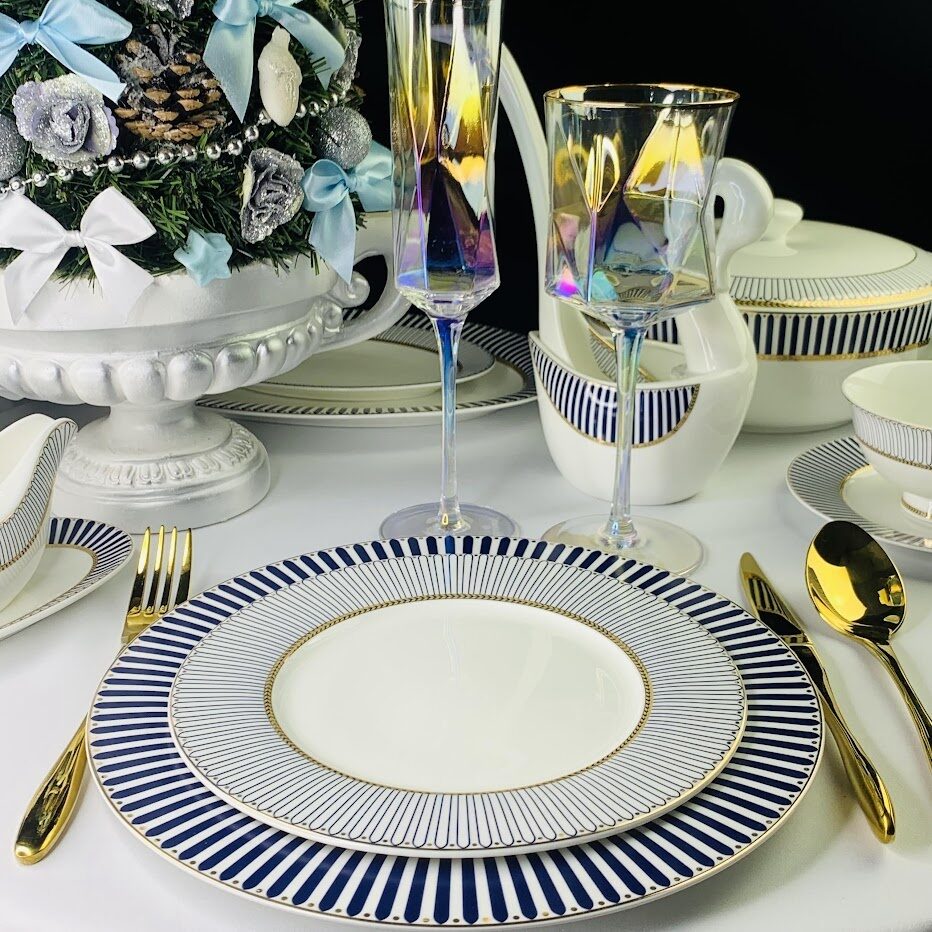 Коллекция посуды ИНФАНТА выполнена в классическом стиле из костяного фарфора. Дизайн глубокого синего цвета идеально сочетается с золотой каймой идеально с тонким прозрачным фарфором, Коллекция представлена: чайным сервизом, кофейным и чайным набором, столовые сервизы 28 и 101 предметов, отдельными позициями тарелок, салатников, овальных блюд. Упаковано в подарочную коробку Материал:костяной фарфор Не рекомендуется использовать в микроволновой печи и мыть в посудомоечной машине, по причине возможного повреждения золотого декоративного покрытия.
