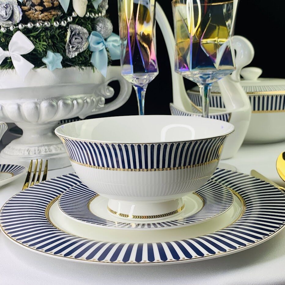 Коллекция посуды ИНФАНТА выполнена в классическом стиле из костяного фарфора. Дизайн глубокого синего цвета идеально сочетается с золотой каймой идеально с тонким прозрачным фарфором, Коллекция представлена: чайным сервизом, кофейным и чайным набором, столовые сервизы 28 и 101 предметов, отдельными позициями тарелок, салатников, овальных блюд. Упаковано в подарочную коробку Материал:костяной фарфор Не рекомендуется использовать в микроволновой печи и мыть в посудомоечной машине, по причине возможного повреждения золотого декоративного покрытия.