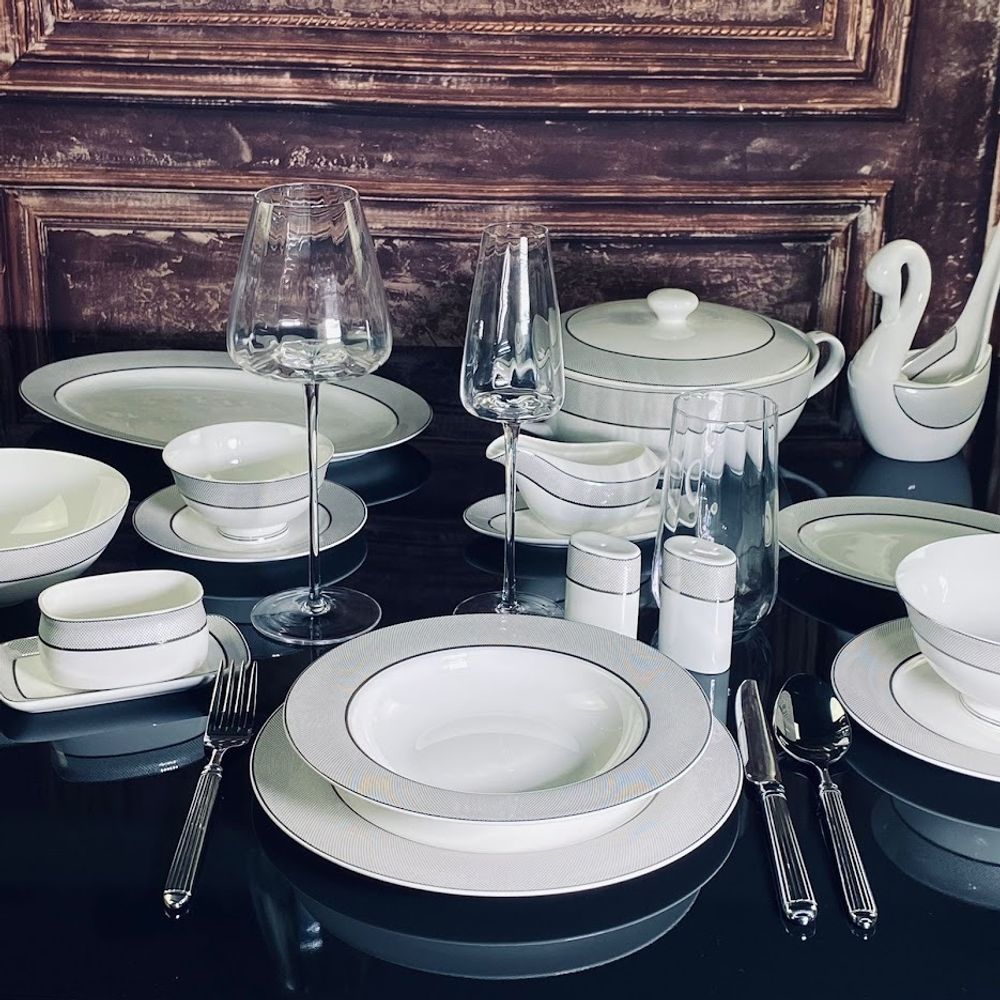 Коллекция СЕРЕБРЯНАЯ СИМФОНИЯ изготовлена из воздушного костяного фарфора. Декор выполнен в классическом серебряном рисунке. Коллекция состоит предметов сервировки, чайных и кофейных сервизов