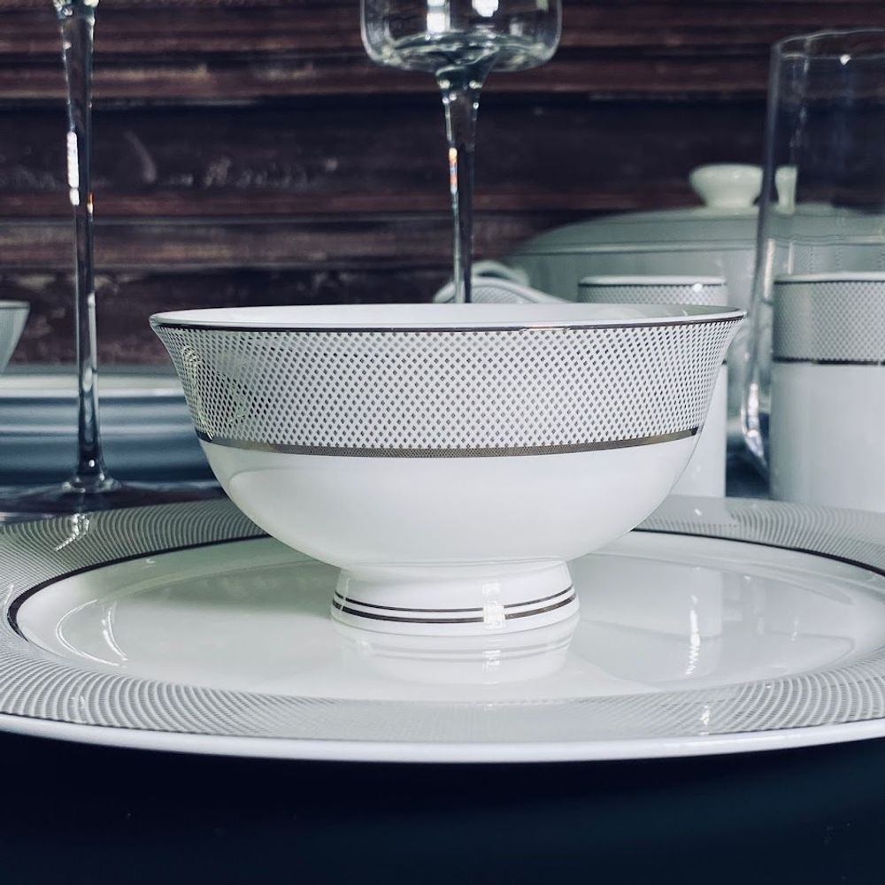 Коллекция СЕРЕБРЯНАЯ СИМФОНИЯ изготовлена из воздушного костяного фарфора. Декор выполнен в классическом серебряном рисунке. Коллекция состоит предметов сервировки, чайных и кофейных сервизов Упаковано в подарочную коробку Материал: костяной фарфор Не рекомендуется использовать в микроволновой печи и мыть в посудомоечной машине, по причине возможного повреждения серебряного декоративного покрытия.