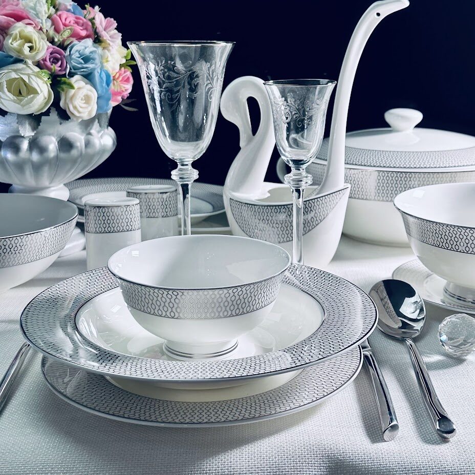 Коллекция СЕВИЛЬЯ СЕРЕБРО изготовлена из воздушного костяного фарфора. Декор выполнен в классическом серебряном рисунке в виде медовых сот. Коллекция состоит предметов сервировки, чайных и кофейных сервизов