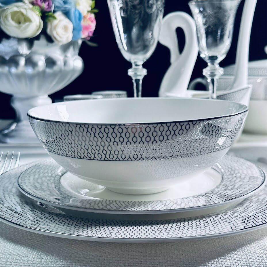 Коллекция СЕВИЛЬЯ СЕРЕБРО изготовлена из воздушного костяного фарфора. Декор выполнен в классическом серебряном рисунке в виде медовых сот. Коллекция состоит предметов сервировки, чайных и кофейных сервизов