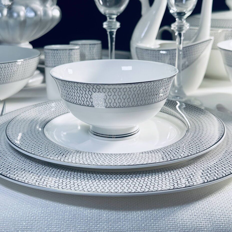 Коллекция СЕВИЛЬЯ СЕРЕБРО изготовлена из воздушного костяного фарфора. Декор выполнен в классическом серебряном рисунке в виде медовых сот. Коллекция состоит предметов сервировки, чайных и кофейных сервизов
