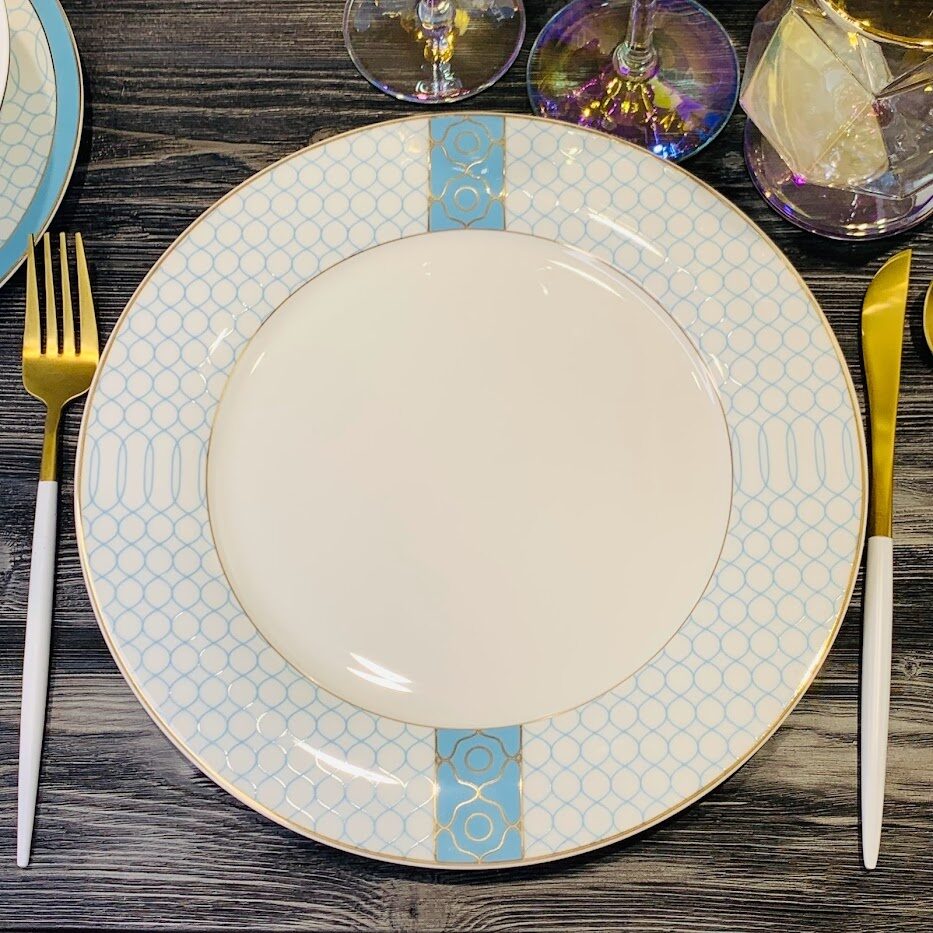 Коллекция ТИФФАНИ изготовлена из легкого костяного фарфора. В декоре мы совместили классические и современные техники. Узор на лазурно голубой деколи выполнен на одних изделиях золотом, на других белого цвета. Одни тарелки только с голубым узором, другие с голубой деколью на бортах. Эти комбинации делают коллекцию воздушной и легкой. Великолепное сочетание тонкого белоснежного костяного фарфора и лазурного декора. Коллекция состоит предметов сервировки, чайных и кофейных сервизов