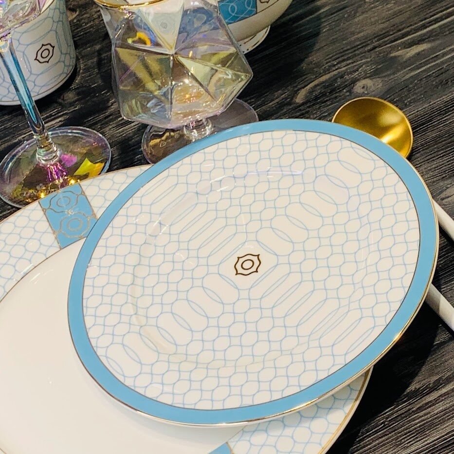 Коллекция ТИФФАНИ изготовлена из легкого костяного фарфора. В декоре мы совместили классические и современные техники. Узор на лазурно голубой деколи выполнен на одних изделиях золотом, на других белого цвета. Одни тарелки только с голубым узором, другие с голубой деколью на бортах. Эти комбинации делают коллекцию воздушной и легкой. Великолепное сочетание тонкого белоснежного костяного фарфора и лазурного декора. Коллекция состоит предметов сервировки, чайных и кофейных сервизов