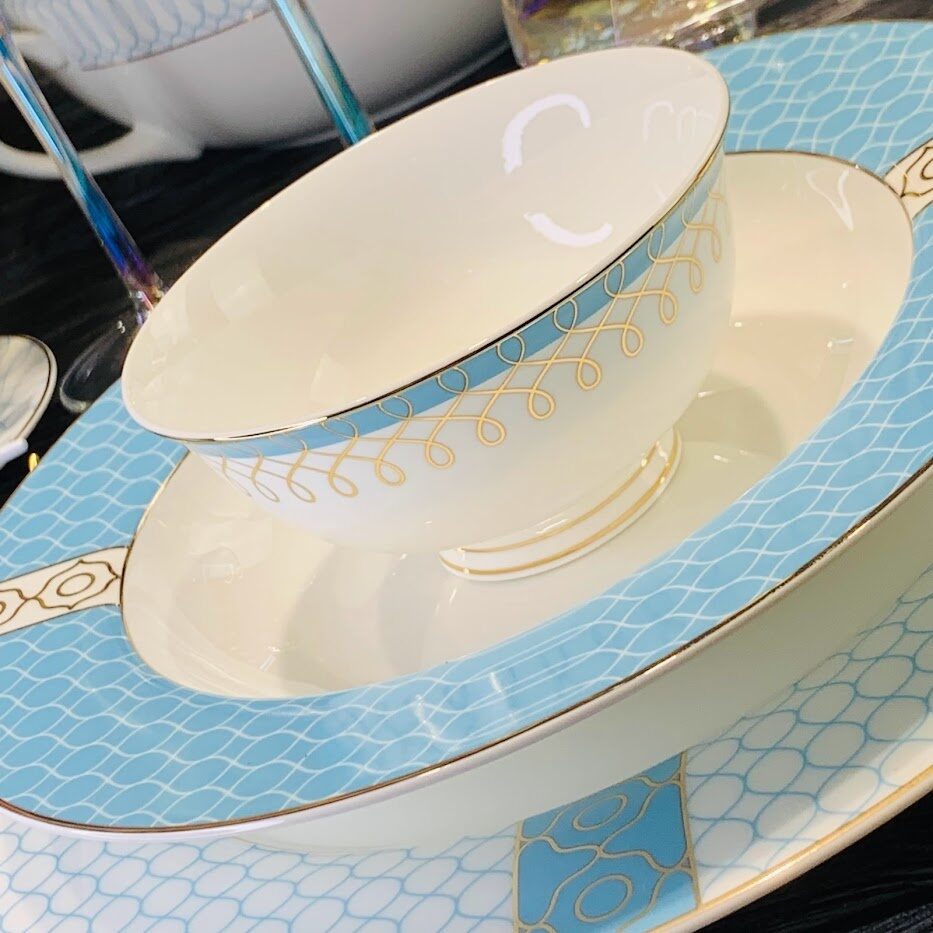 Коллекция ТИФФАНИ изготовлена из легкого костяного фарфора. В декоре мы совместили классические и современные техники. Узор на лазурно голубой деколи выполнен на одних изделиях золотом, на других белого цвета. Одни тарелки только с голубым узором, другие с голубой деколью на бортах. Эти комбинации делают коллекцию воздушной и легкой. Великолепное сочетание тонкого белоснежного костяного фарфора и лазурного декора. Коллекция состоит предметов сервировки, чайных и кофейных сервизов