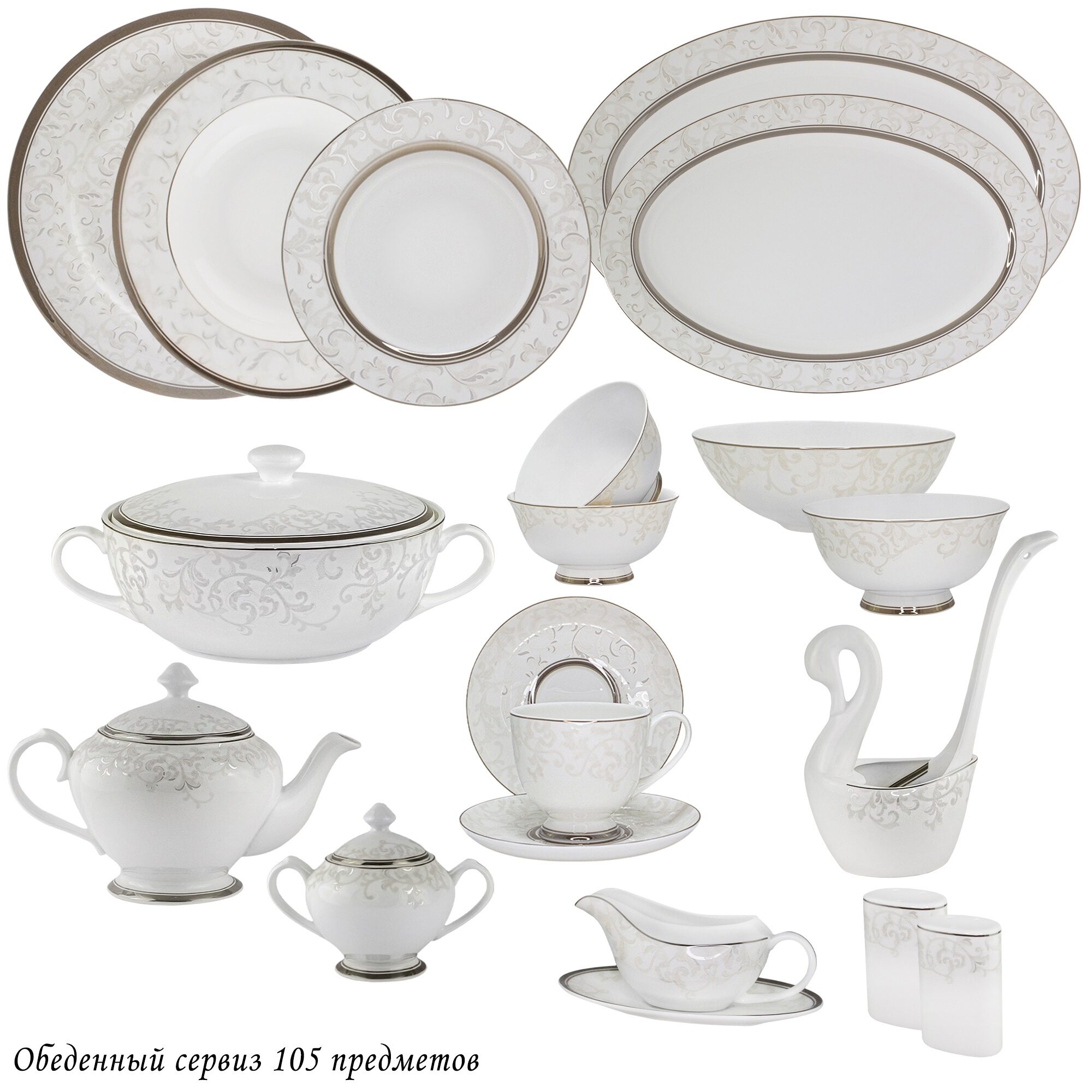 Коллекция СЕРЫЙ ШЕЛК изготовлена из легкого костяного фарфора. Декор выполнен в виде полупрозрачных с перламутровыми элементами цветах, часть элементов видна при определённом освещении. Серебряная окантовка подчеркивает нежность перламутровых элементов. Коллекция состоит предметов сервировки, чайных и кофейных сервизов