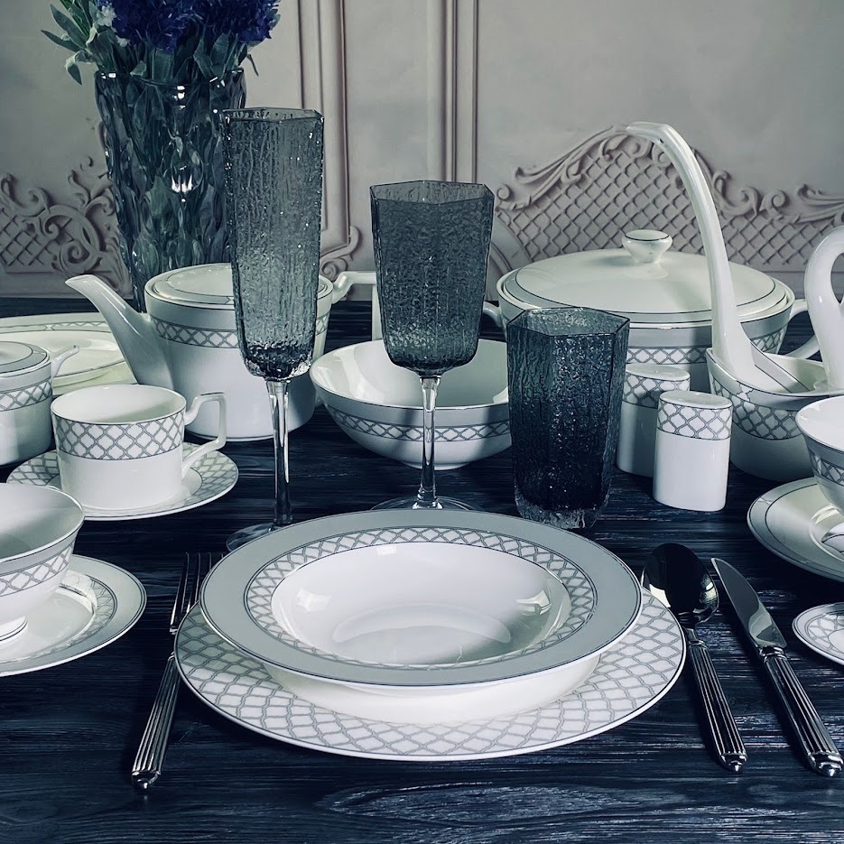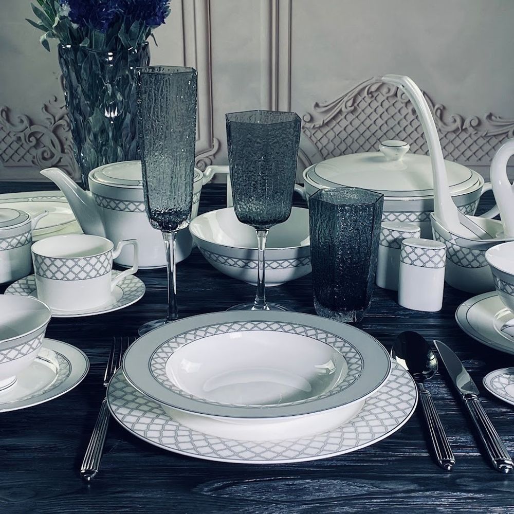 Изысканная коллекция ВЕРСАЛЬ изготовлена из полупрозрачного костяного фарфора. Изысканная палитра, сочетающая в себе нежные оттенки матового серого цвета и серебряного декора, очаровывает своей глубиной и игрой света. Изящный серебряный края, словно лунный свет, обрамляет тарелки. Утонченный рисунок из выполнен с искусной точностью. Коллекция состоит из предметов сервировка, обеденных, чайных и кофейных сервизов.