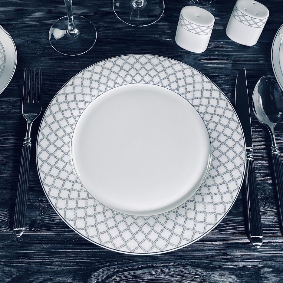 Изысканная коллекция ВЕРСАЛЬ изготовлена из полупрозрачного костяного фарфора. Изысканная палитра, сочетающая в себе нежные оттенки матового серого цвета и серебряного декора, очаровывает своей глубиной и игрой света. Изящный серебряный края, словно лунный свет, обрамляет тарелки. Утонченный рисунок из выполнен с искусной точностью. Коллекция состоит из предметов сервировка, обеденных, чайных и кофейных сервизов. Материал: фарфор Не рекомендуется использовать в микроволновой печи и мыть в посудомоечной машине, по причине возможного повреждения золотого декоративного покрытия.
