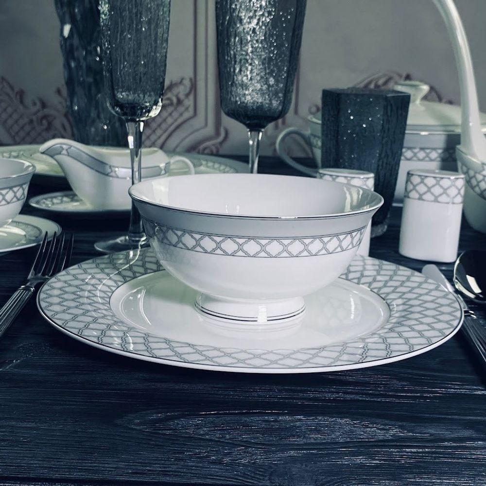 Изысканная коллекция ВЕРСАЛЬ изготовлена из полупрозрачного костяного фарфора. Изысканная палитра, сочетающая в себе нежные оттенки матового серого цвета и серебряного декора, очаровывает своей глубиной и игрой света. Изящный серебряный края, словно лунный свет, обрамляет тарелки. Утонченный рисунок из выполнен с искусной точностью. Коллекция состоит из предметов сервировка, обеденных, чайных и кофейных сервизов.