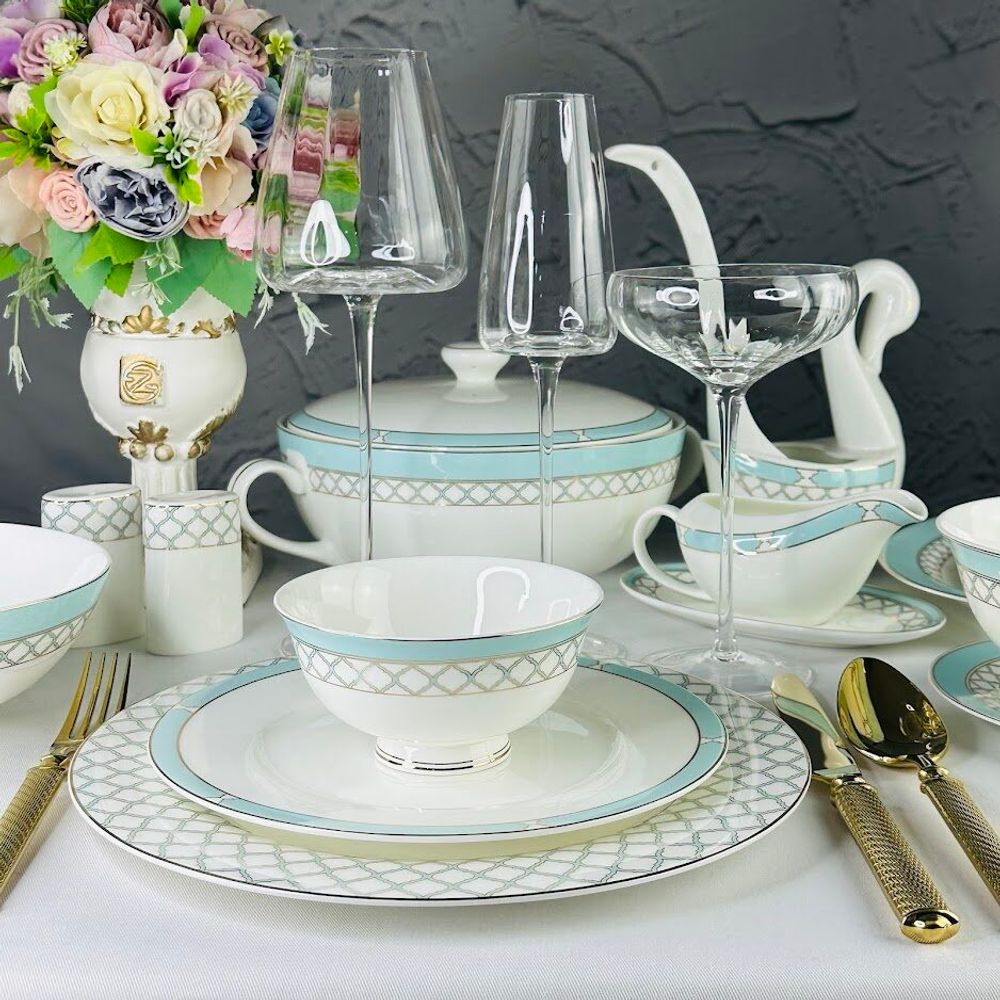 Изысканная коллекция ВЕРСАЛЬ изготовлена из полупрозрачного костяного фарфора. Изысканная палитра, сочетающая в себе нежные оттенки небесно-голубого цвета и золотого декора, очаровывает своей глубиной и игрой света. Изящные позолоченные края, словно лучи солнца, обрамляют тарелки. Утонченный рисунок из немецкого золота выполнен с искусной точностью. Коллекция состоит из предметов сервировка, обеденных, чайных и кофейных сервизов.