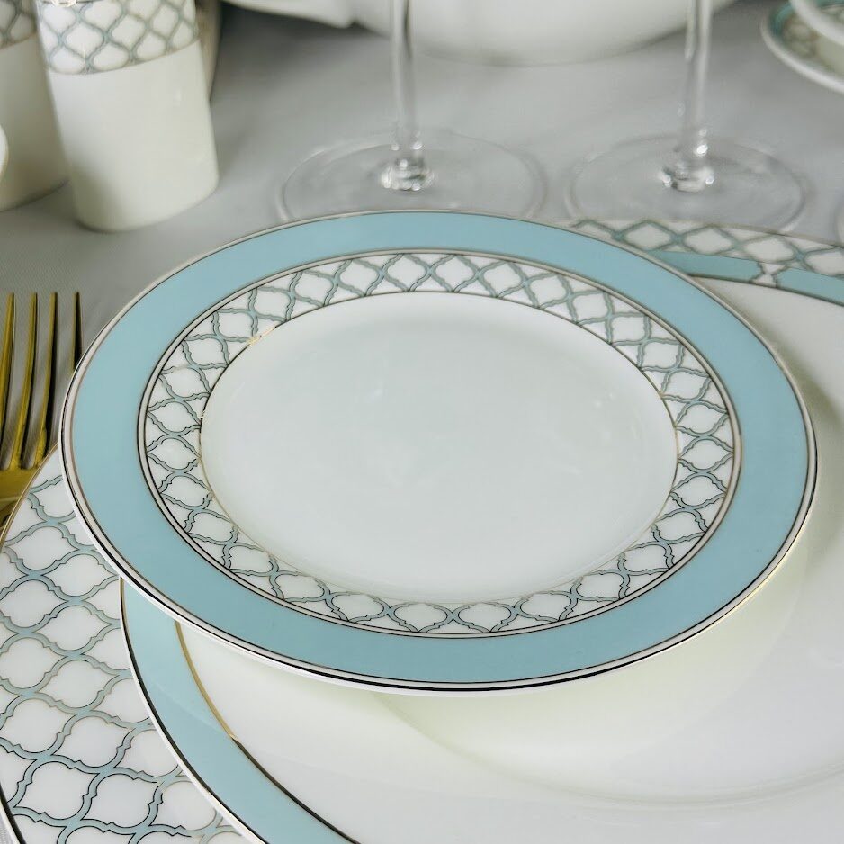 Изысканная коллекция ВЕРСАЛЬ изготовлена из полупрозрачного костяного фарфора. Изысканная палитра, сочетающая в себе нежные оттенки небесно-голубого цвета и золотого декора, очаровывает своей глубиной и игрой света. Изящные позолоченные края, словно лучи солнца, обрамляют тарелки. Утонченный рисунок из немецкого золота выполнен с искусной точностью. Коллекция состоит из предметов сервировка, обеденных, чайных и кофейных сервизов.