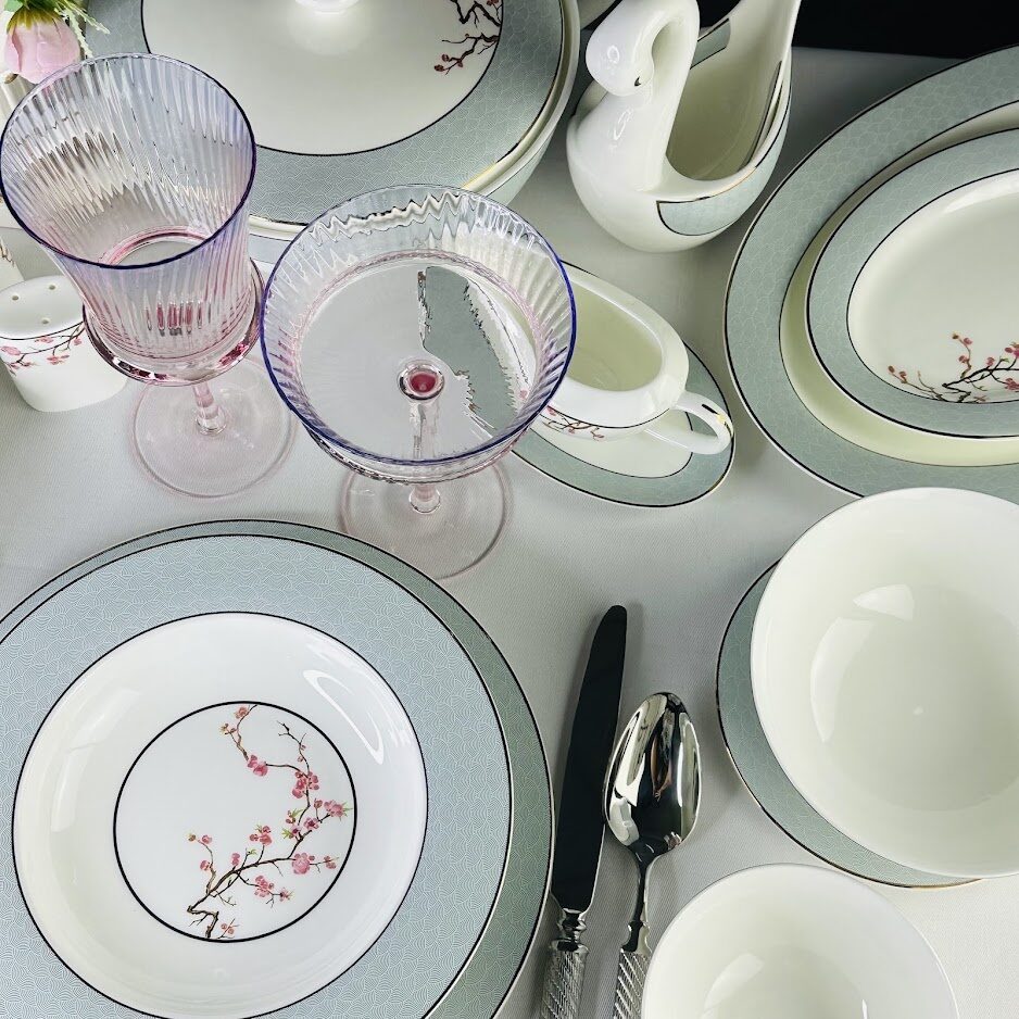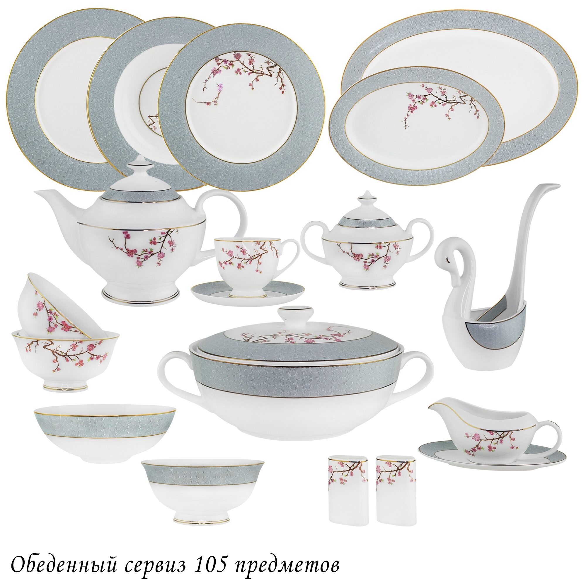 Коллекция САКУРА выполнена из воздушного костяного фарфора. Орнамент на бортах в рельефном исполнении, сочетает модный серый цвет с белой паутинкой. Нежная розовая ветка сакуры оттеняет рисунок борта, отводка золотом. Коллекция состоит предметов сервировки, чайных и кофейных сервизов
