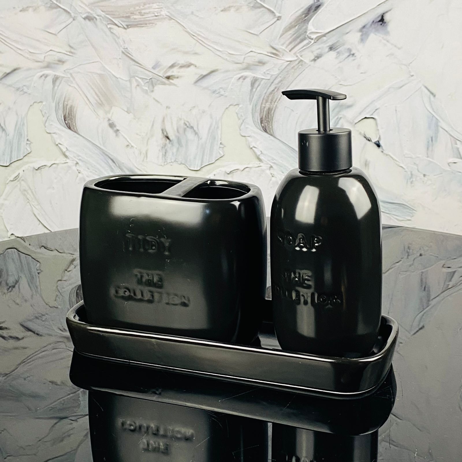 Набор аксессуаров для ванной комнаты состоит из трех предметов: подставка, дозатор для жидкого мыла, стакан для зубных щеток, . Набор выполнен из высококачественного фарфора с глянцевой черной эмалью