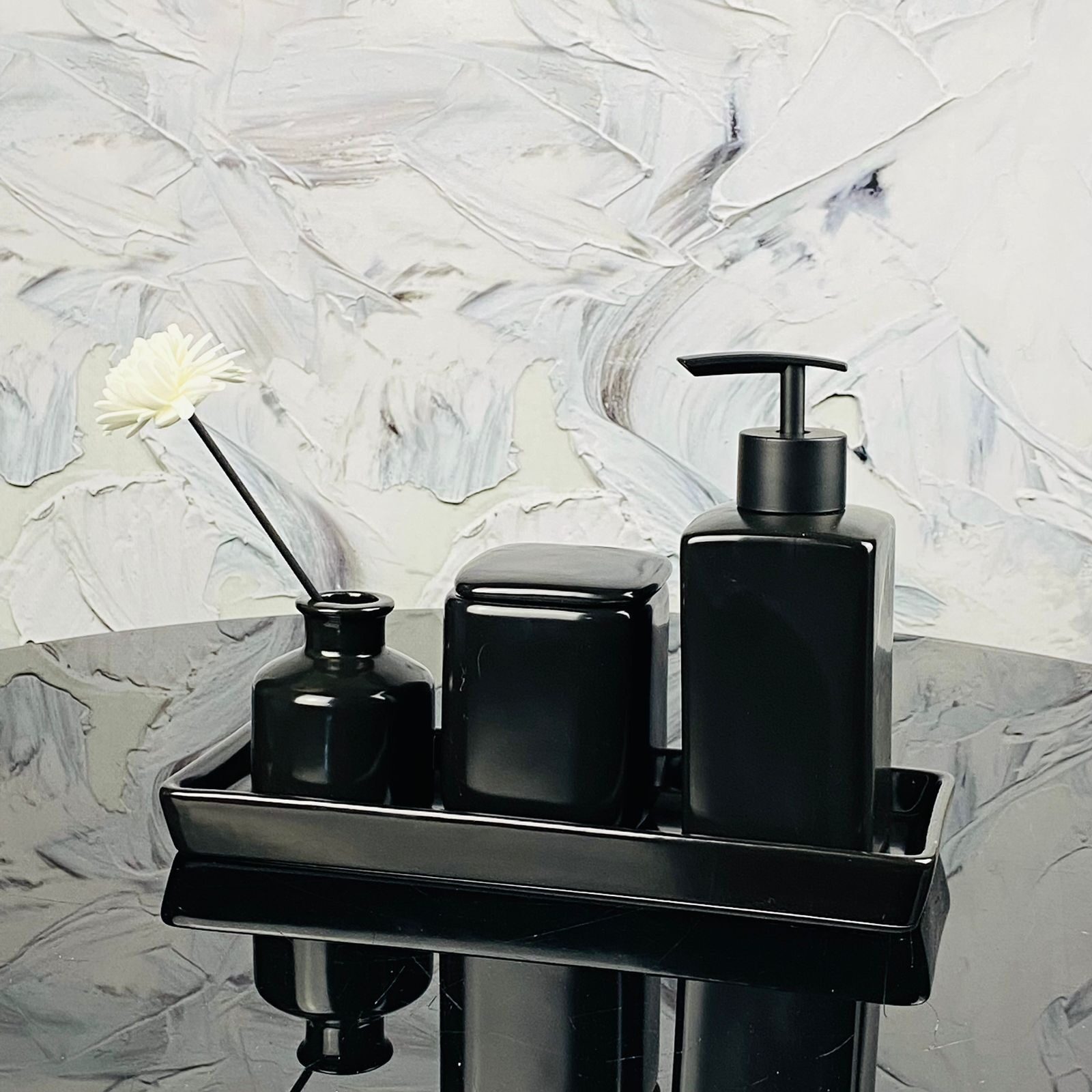 Набор аксессуаров для ванной комнаты состоит из четырем предметов: подставка, дозатор для жидкого мыла, стакан зубных щеток, бутылочка для аромапалочек (аромацветок в комплекте без ароматизатора) Набор выполнен из высококачественного фарфора с черной матовой эмалью.
