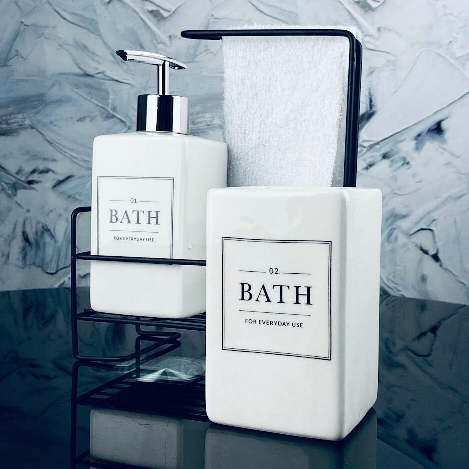 Набор аксессуаров для ванной комнаты состоит из четырем предметов: подставка, дозатор для жидкого мыла, стакан зубных щеток, салфетка хлопковая. Набор выполнен из высококачественного фарфора с черной матовой эмалью.