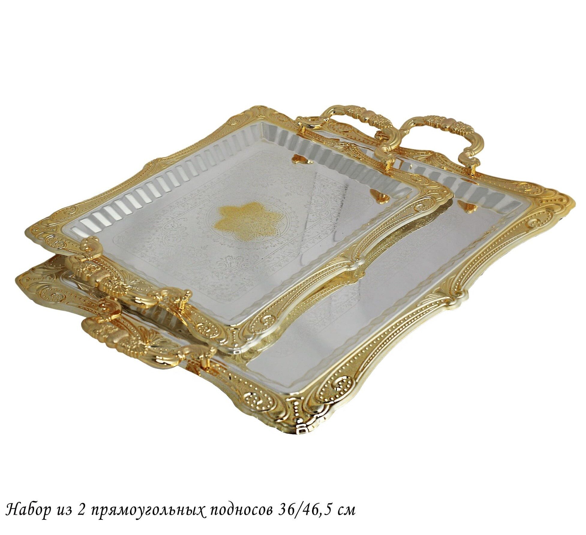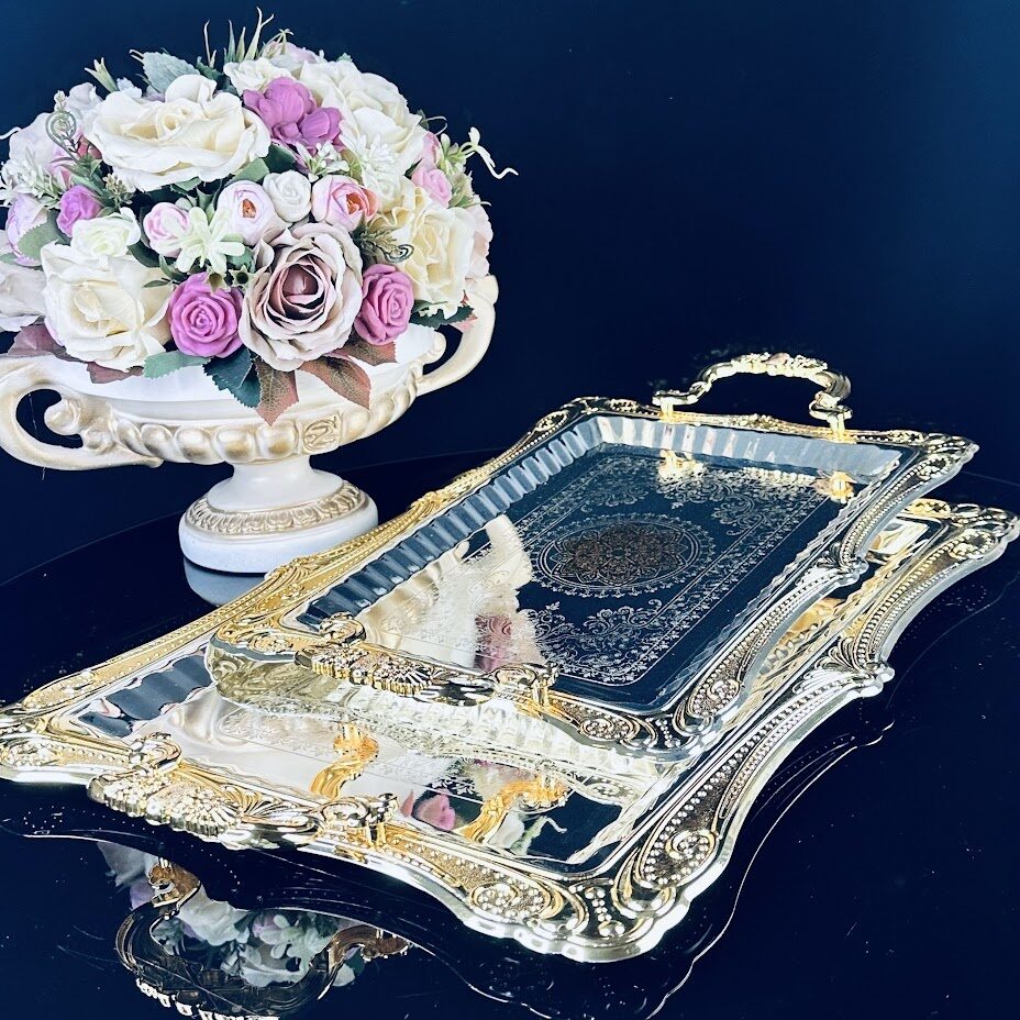 Набор из двух сервировочных подносов разного размера, изготовленных из нержавеющей стали с зеркальной полировкой и кружевным краем станет незаменимым предметом для сервировки стола.Серебристый поднос с золотыми декоративными элементами привносит элегантность и утонченность в оформление вашего стола. Ручки обеспечивают удобство при переноске и позволяют комфортно держать поднос, что особенно важно, когда вы подаете горячие блюда или напитки. Материал: нержавеющая сталь Упаковано в подарочную коробку Мыть мягкой губкой без использования абразивных средств