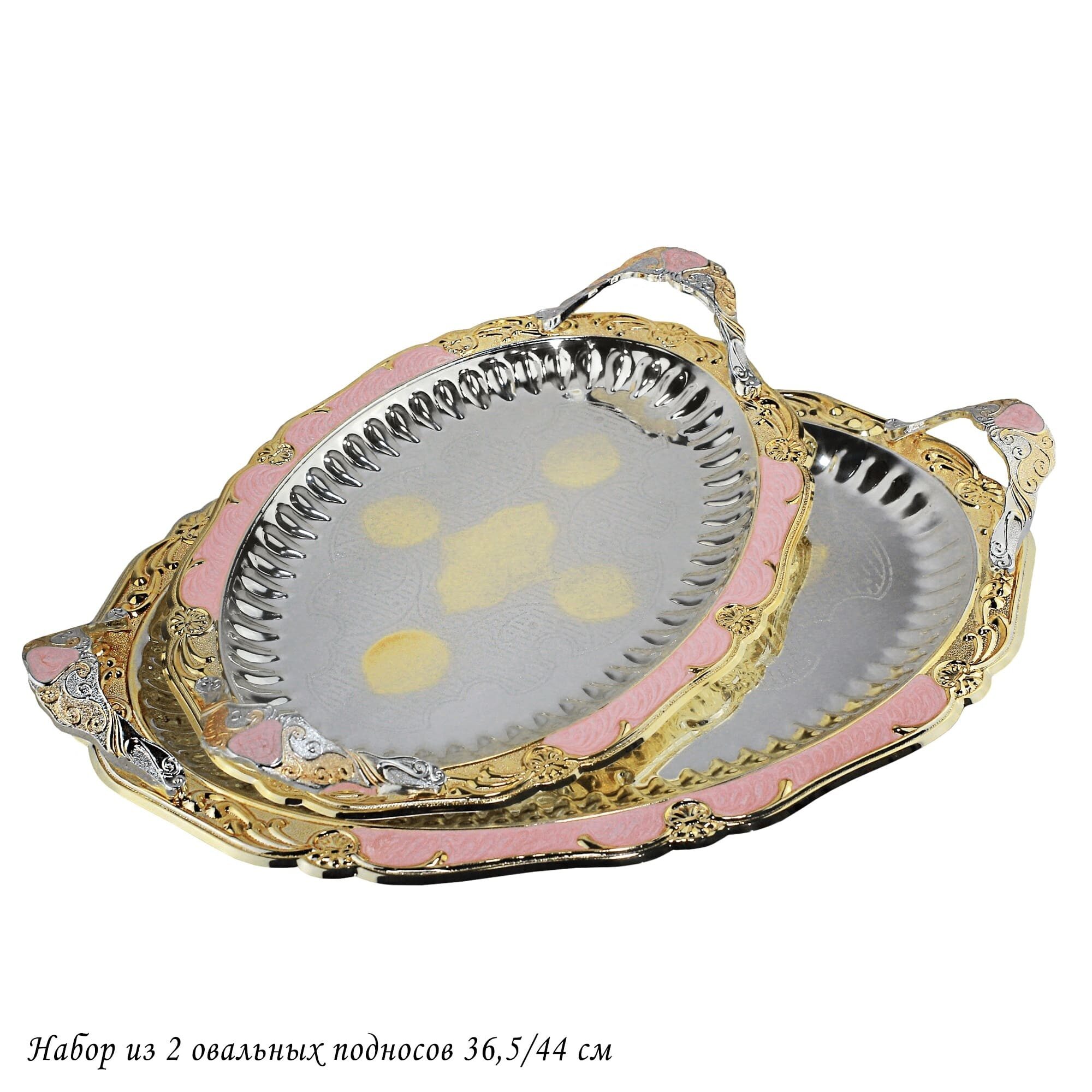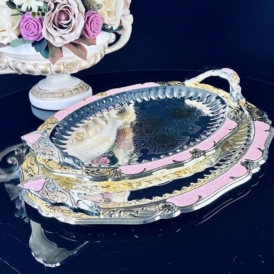 Набор из двух сервировочных подносов разного размера, изготовленных из нержавеющей стали с зеркальной полировкой и кружевным краем станет незаменимым предметом для сервировки стола.Серебристый поднос с золотыми декоративными элементами привносит элегантность и утонченность в оформление вашего стола. Ручки обеспечивают удобство при переноске и позволяют комфортно держать поднос, что особенно важно, когда вы подаете горячие блюда или напитки.