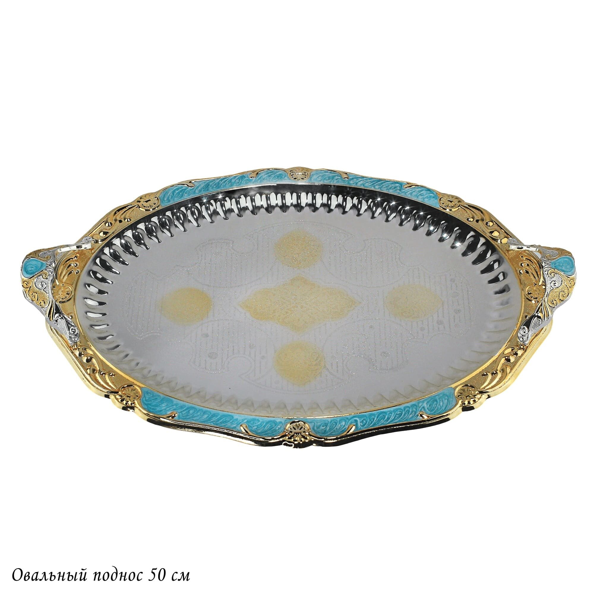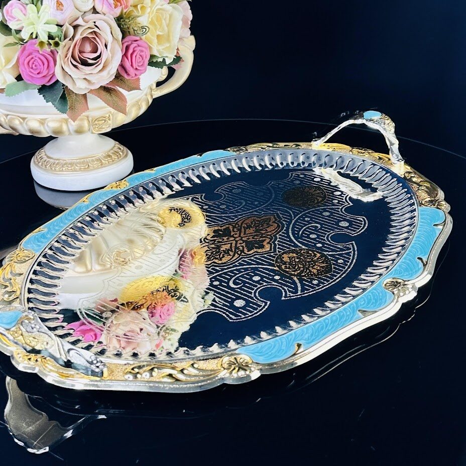 Сервировочный поднос, изготовлен из нержавеющей стали с зеркальной полировкой и кружевным краем украшенным цветной эмалью станет незаменимым предметом для сервировки стола.Серебристый поднос с золотыми декоративными элементами привносит элегантность и утонченность в оформление вашего стола. Ручки обеспечивают удобство при переноске и позволяют комфортно держать поднос, что особенно важно, когда вы подаете горячие блюда или напитки.