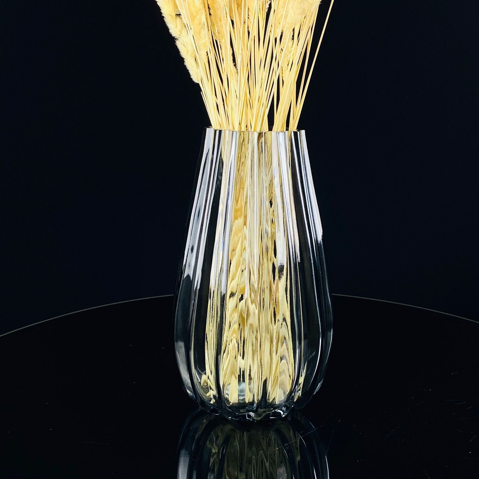 Оригинальная настольная ваза изготовлена из цветного прозрачного стекла, имеет устойчивое дно и достаточно широкое горлышко. Вазу имеет рифленые и ребристые стенки, выполнена из толстого стекла, что гарантирует ее прочность и долговечность.