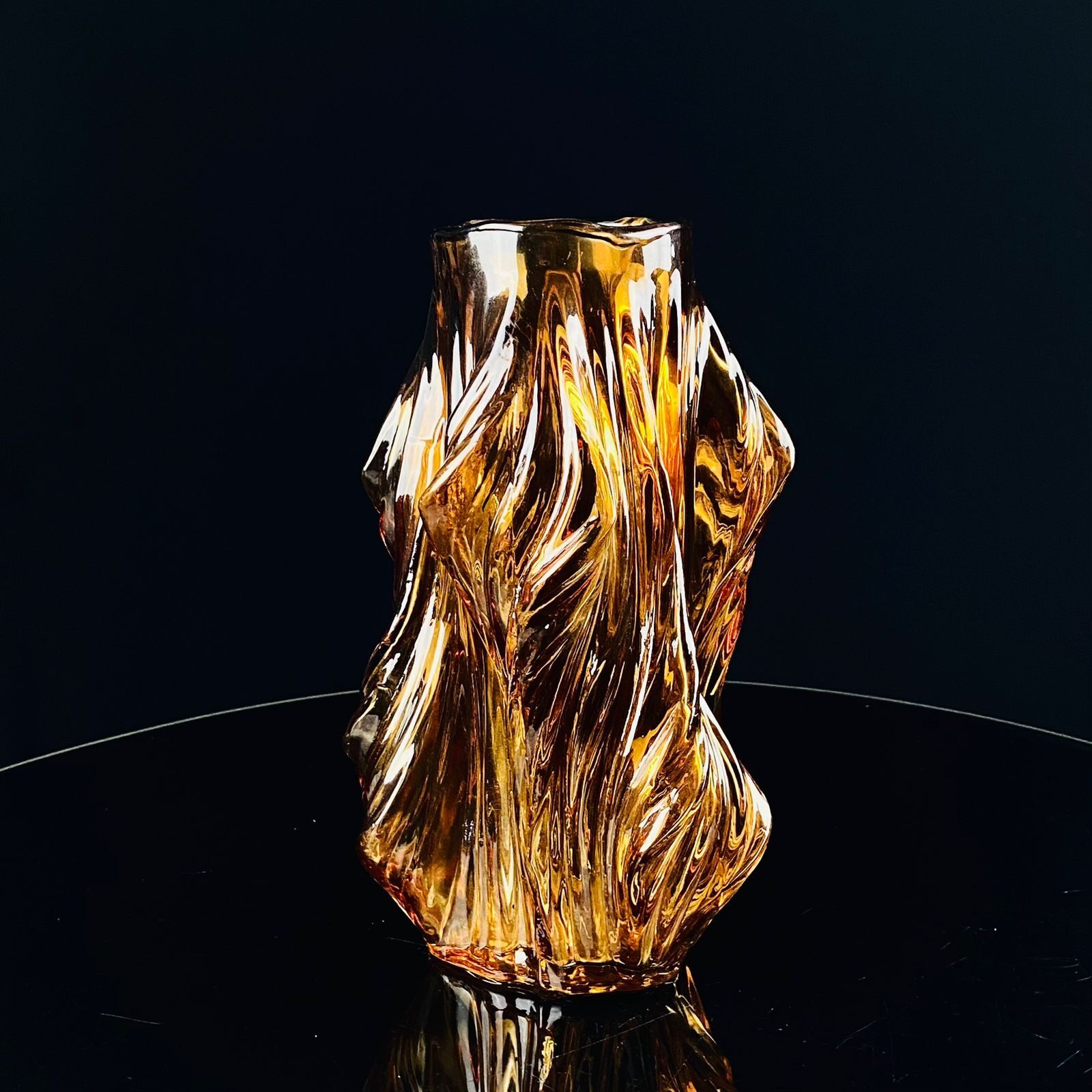 Оригинальная настольная ваза изготовлена из цветного прозрачного стекла, имеет устойчивое дно и достаточно широкое горлышко. Вазу имеет рифленые и ребристые стенки, выполнена из толстого стекла, что гарантирует ее прочность и долговечность.