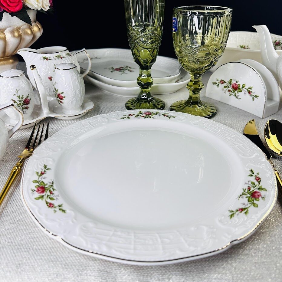 Коллекция ДОМИНИКА выполнена в стиле барокко и производится из белого фарфора c золотой каймой. Изделия украшены рельефным декором, изящно подчеркивающими благородство фарфора, узорные края выглядят элегантно и всегда в тренде посудной моды. В росписи фарфора излюбленным цветком считается роза, вот и мы решили расписать коллекцию английскими розами. Кроме наборов и сервизов в серию входят множество отдельных фарфоровых предметов, ассортимент которых с каждым годом расширяется. Материал:фарфор Не рекомендуется использовать в микроволновой печи и мыть в посудомоечной машине, по причине возможного повреждения декоративного покрытия.