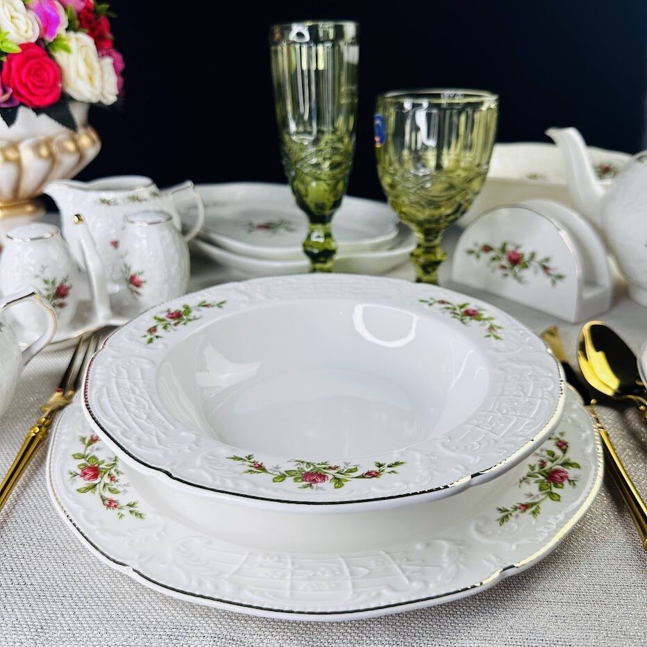 Коллекция ДОМИНИКА выполнена в стиле барокко и производится из белого фарфора c золотой каймой. Изделия украшены рельефным декором, изящно подчеркивающими благородство фарфора, узорные края выглядят элегантно и всегда в тренде посудной моды. В росписи фарфора излюбленным цветком считается роза, вот и мы решили расписать коллекцию английскими розами.