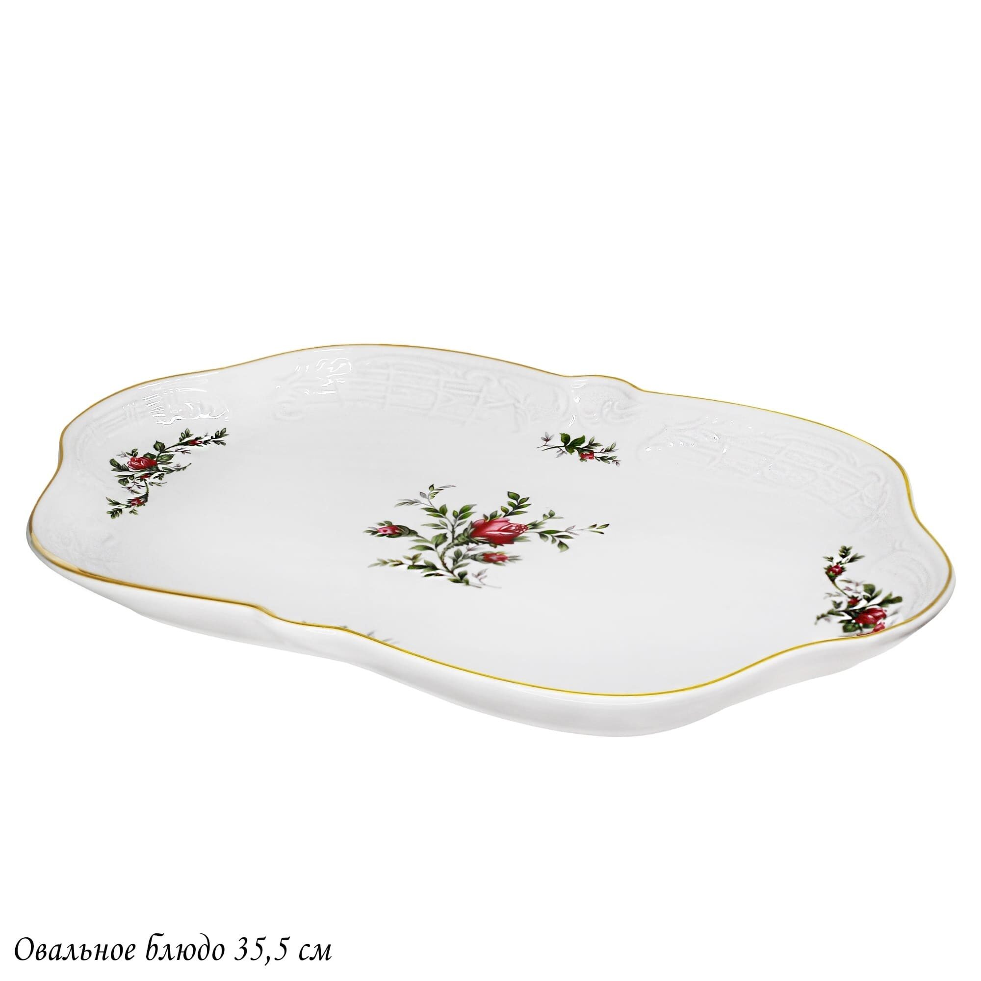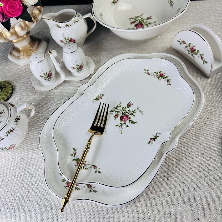 Коллекция ДОМИНИКА выполнена в стиле барокко и производится из белого фарфора c золотой каймой. Изделия украшены рельефным декором, изящно подчеркивающими благородство фарфора, узорные края выглядят элегантно и всегда в тренде посудной моды. В росписи фарфора излюбленным цветком считается роза, вот и мы решили расписать коллекцию английскими розами.