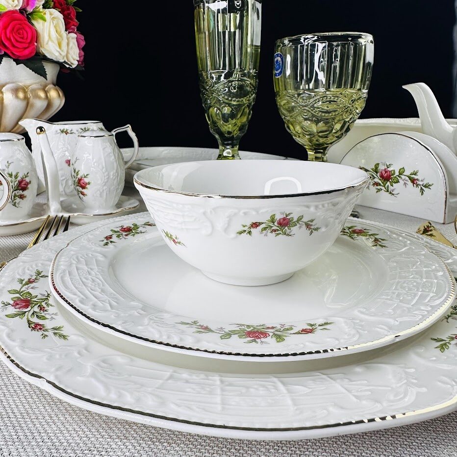 Коллекция ДОМИНИКА выполнена в стиле барокко и производится из белого фарфора c золотой каймой. Изделия украшены рельефным декором, изящно подчеркивающими благородство фарфора, узорные края выглядят элегантно и всегда в тренде посудной моды. В росписи фарфора излюбленным цветком считается роза, вот и мы решили расписать коллекцию английскими розами.