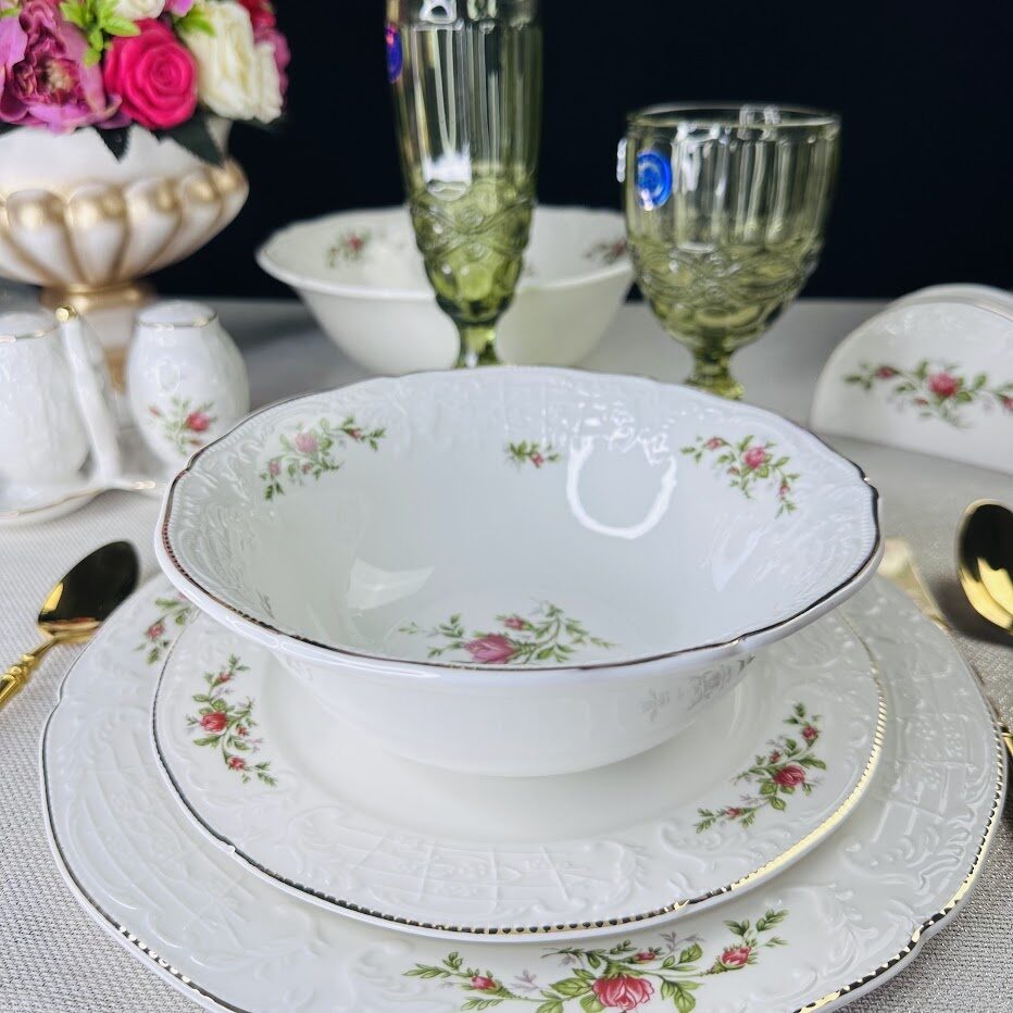 Коллекция ДОМИНИКА выполнена в стиле барокко и производится из белого фарфора c золотой каймой. Изделия украшены рельефным декором, изящно подчеркивающими благородство фарфора, узорные края выглядят элегантно и всегда в тренде посудной моды. В росписи фарфора излюбленным цветком считается роза, вот и мы решили расписать коллекцию английскими розами. Кроме наборов и сервизов в серию входят множество отдельных фарфоровых предметов, ассортимент которых с каждым годом расширяется. Материал:фарфор Не рекомендуется использовать в микроволновой печи и мыть в посудомоечной машине, по причине возможного повреждения декоративного покрытия.