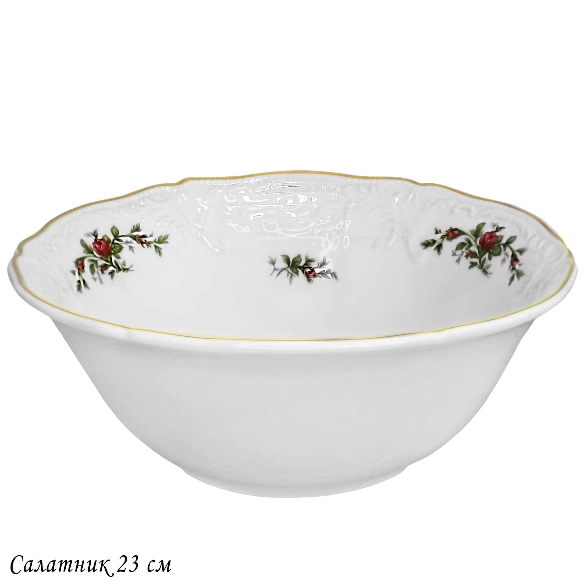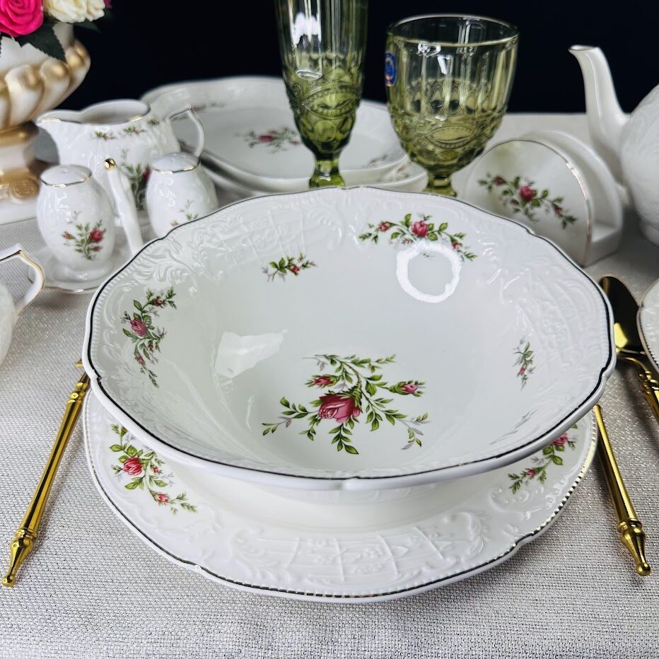 Коллекция ДОМИНИКА выполнена в стиле барокко и производится из белого фарфора c золотой каймой. Изделия украшены рельефным декором, изящно подчеркивающими благородство фарфора, узорные края выглядят элегантно и всегда в тренде посудной моды. В росписи фарфора излюбленным цветком считается роза, вот и мы решили расписать коллекцию английскими розами.