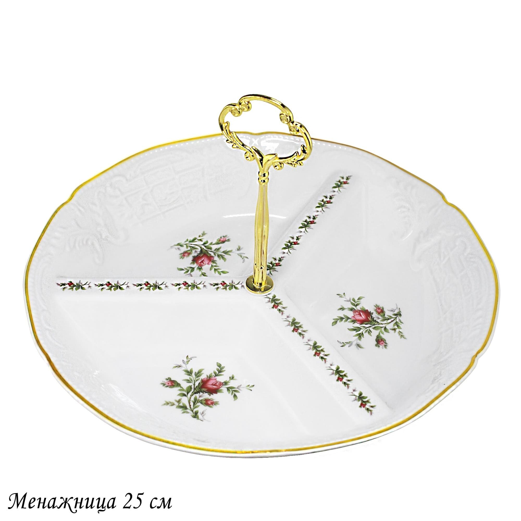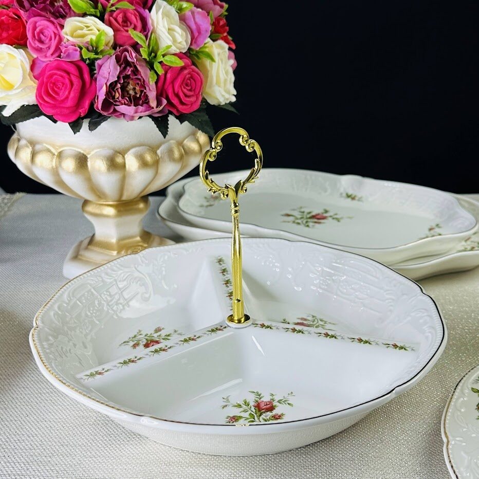 Коллекция ДОМИНИКА выполнена в стиле барокко и производится из белого фарфора c золотой каймой. Изделия украшены рельефным декором, изящно подчеркивающими благородство фарфора, узорные края выглядят элегантно и всегда в тренде посудной моды. В росписи фарфора излюбленным цветком считается роза, вот и мы решили расписать коллекцию английскими розами.