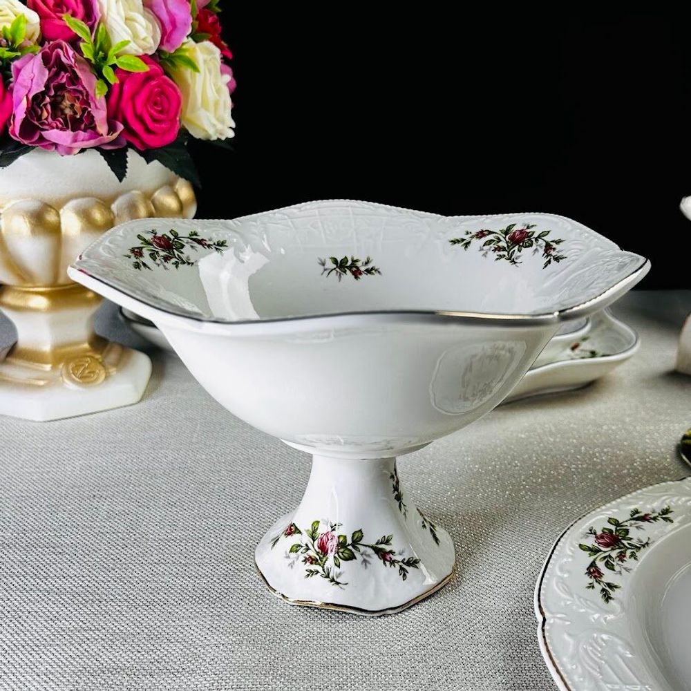 Коллекция ДОМИНИКА выполнена в стиле барокко и производится из белого фарфора c золотой каймой. Изделия украшены рельефным декором, изящно подчеркивающими благородство фарфора, узорные края выглядят элегантно и всегда в тренде посудной моды. В росписи фарфора излюбленным цветком считается роза, вот и мы решили расписать коллекцию английскими розами.