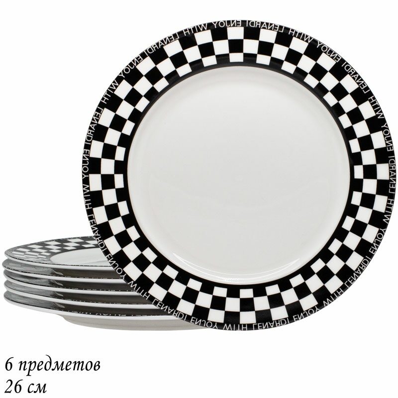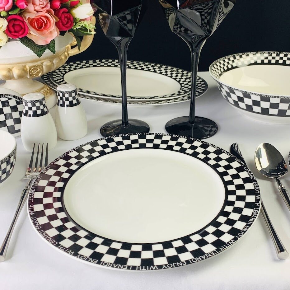 Коллекция посуды ENJOY изготовлена из фарфора. Стильный и современный дизайн в виде шахматной доски, отводка золотом добавляет легкое изящество. Надпись на посуде «Enjoy with Lenardi». Коллекция состоит из тарелок, салатников, блюд, тортовницы, чайных, кофейных и столовых сервизов.