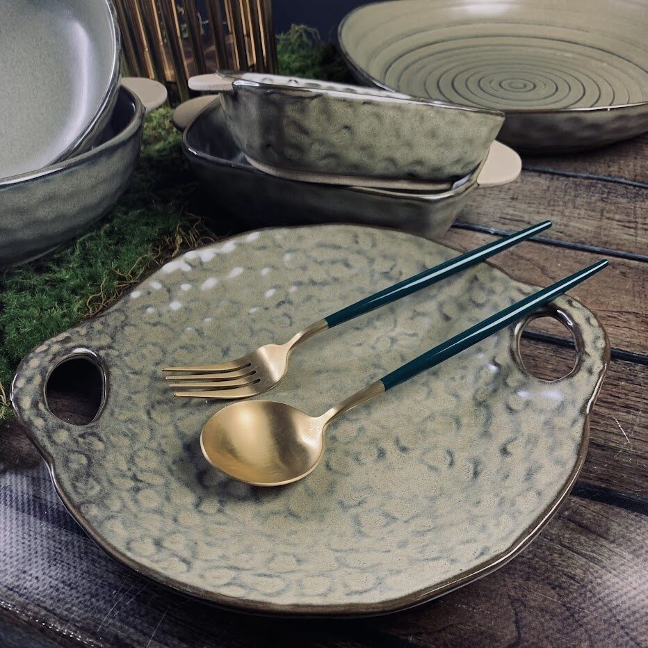 Коллекция Мистраль выполнена из фарфора в зеленовато коричневых тонах с неровной и объемной поверхностью, отводка коричневым ободком. Дно кружек, чашек, форм и салатников выполнено из грубой керамики, придавая посуде оригинальность и неповторимы стиль. Посуда прекрасно подходит как для ресторанов, так и для домашнего использования.