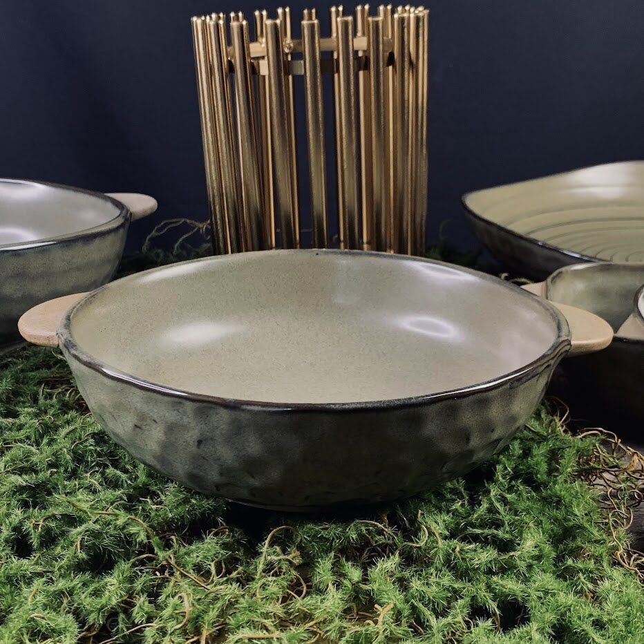 Коллекция Мистраль выполнена из фарфора в зеленовато коричневых тонах с неровной и объемной поверхностью, отводка коричневым ободком. Дно кружек, чашек, форм и салатников выполнено из грубой керамики, придавая посуде оригинальность и неповторимы стиль. Посуда прекрасно подходит как для ресторанов, так и для домашнего использования.